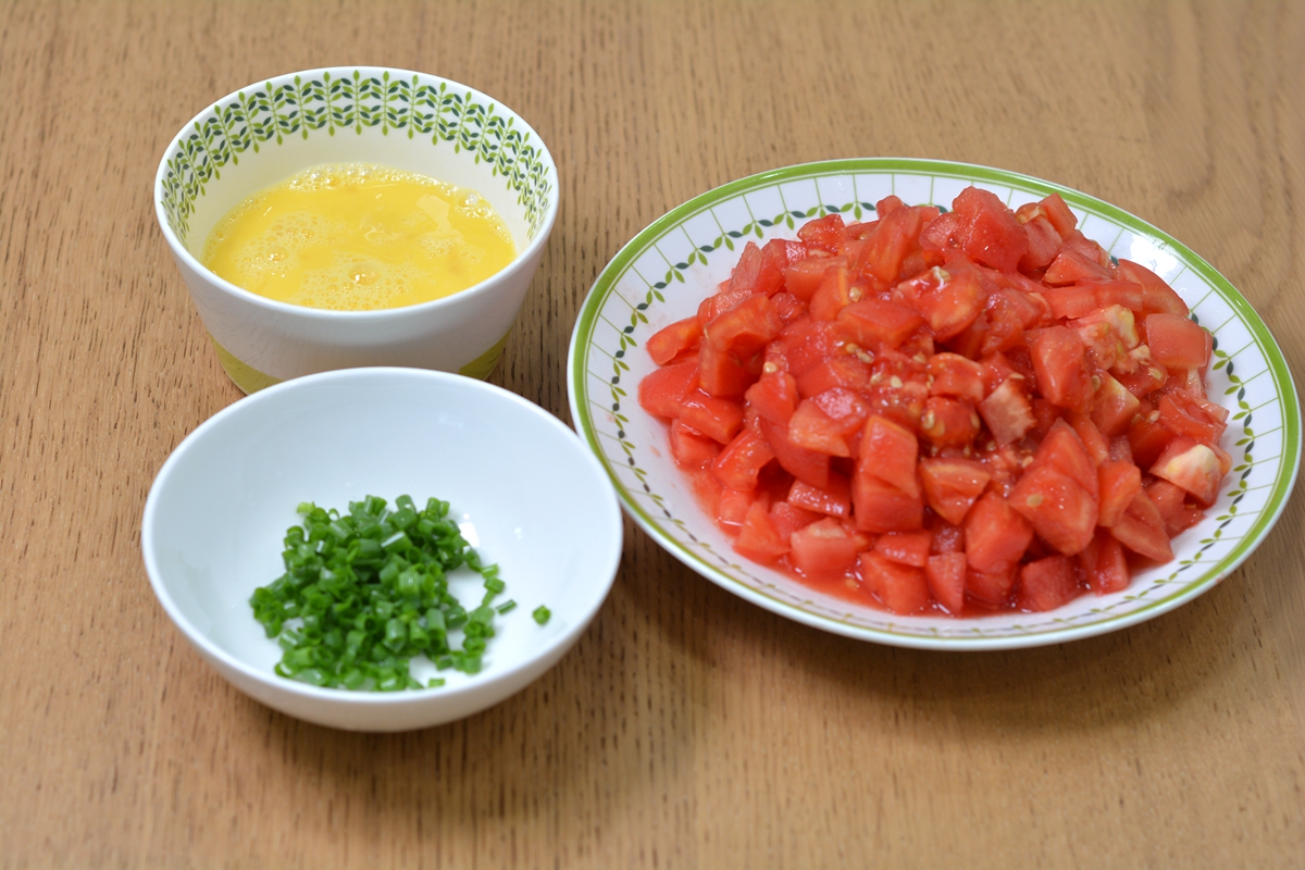 4. 将西红柿切成小丁,鸡蛋磕入碗中充分打散,香葱叶切末;