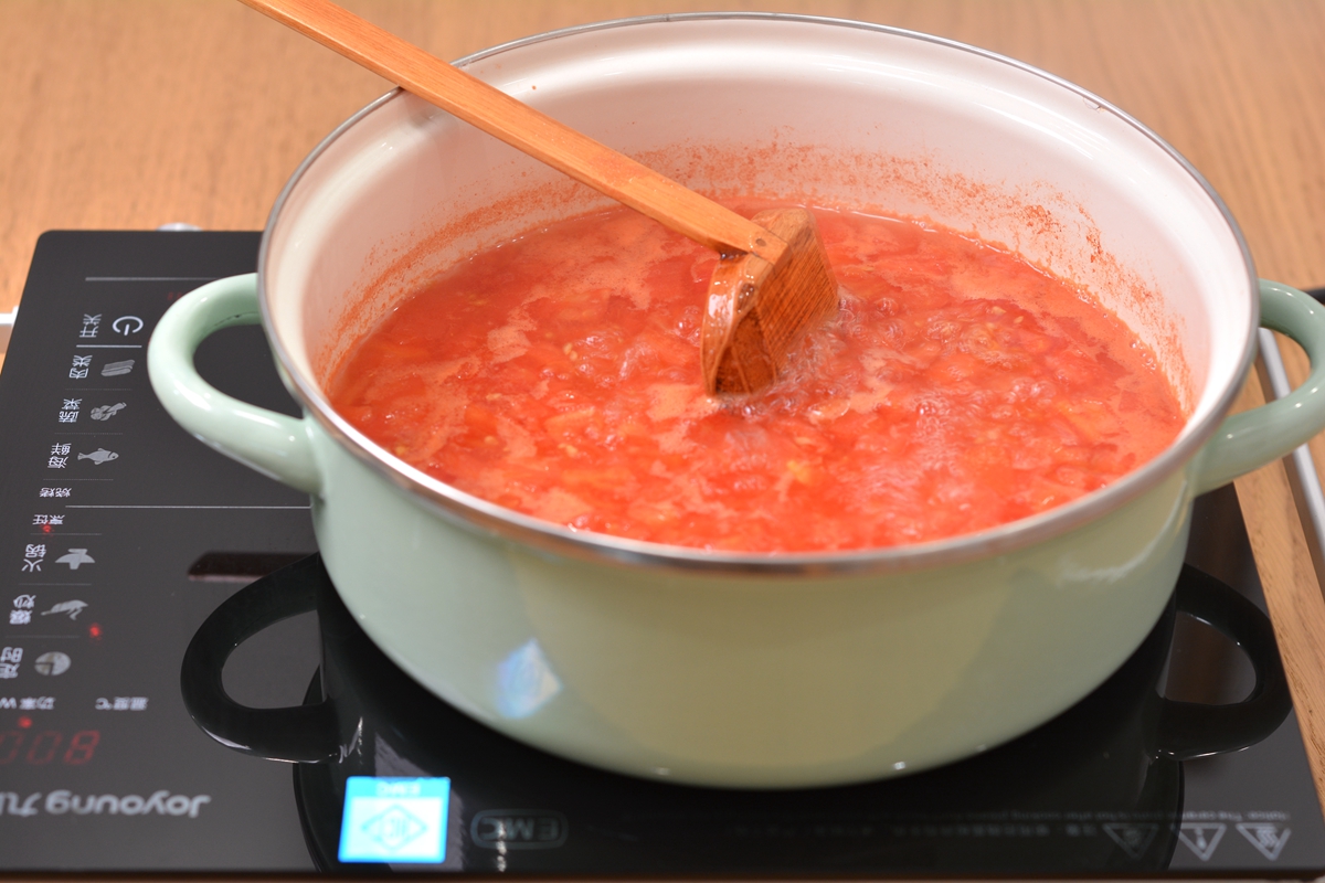 6. 煮锅中倒适量水,将西红柿丁倒入水中,烧开后用勺子搅拌数次,使西红柿尽可能融化进汤中,这样煮出来的汤才酸溜溜;