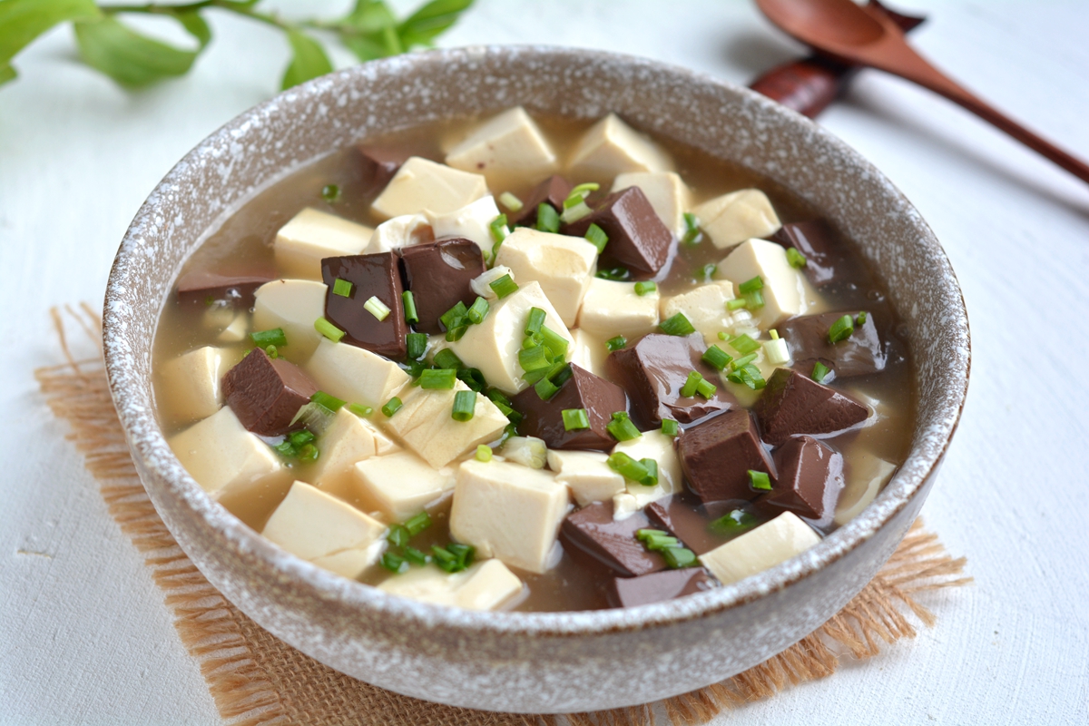 1. 南豆腐、鸭血准备好;南豆腐是相比北豆腐,口感更加细腻,且豆腥味比较淡;