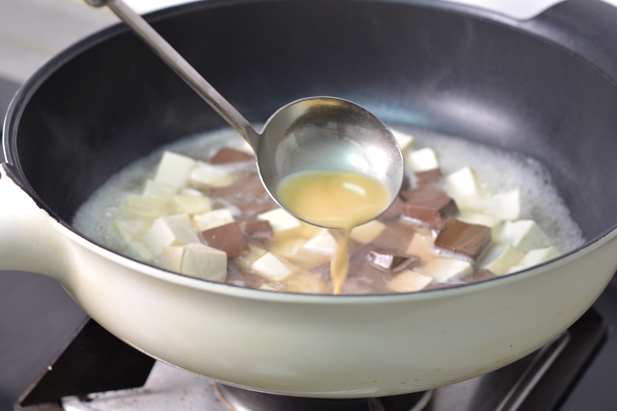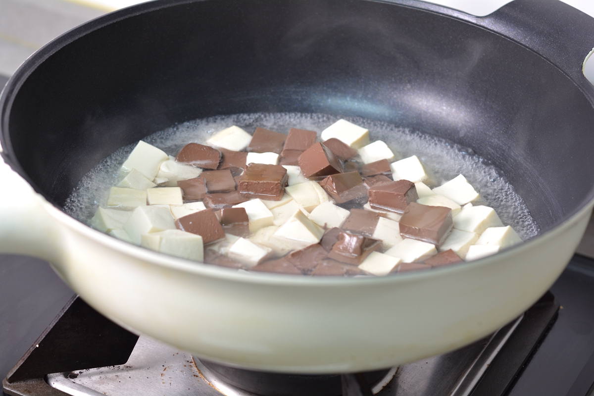 6. 另起锅烧开一碗水,将豆腐和鸭血同入汤中;
