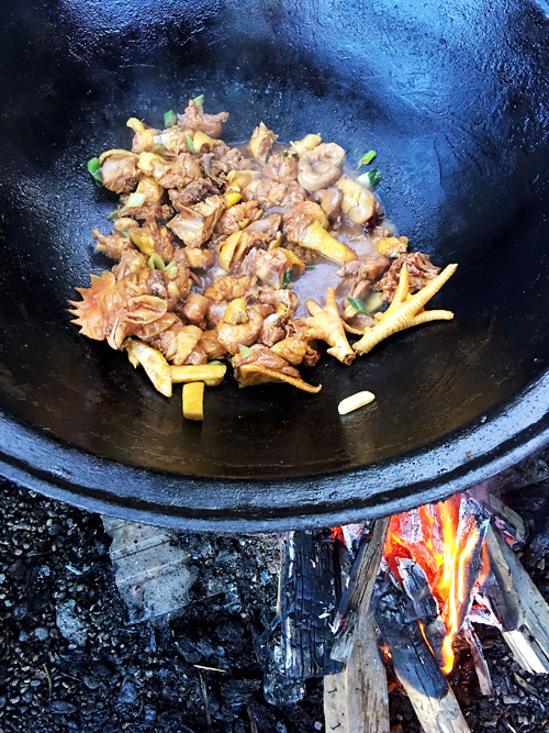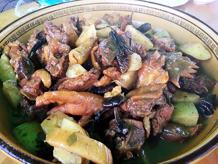 院子里圈养了很多公鸡,东北特色菜小鸡炖蘑菇一定要尝尝看,铁锅旺柴,新鲜鸡肉、土豆野菌,当地特色菜。