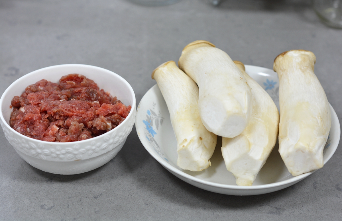 1. 杏鲍菇、牛肉馅准备好;如果想吃一粒粒的牛肉,可以直接牛肉切丁;