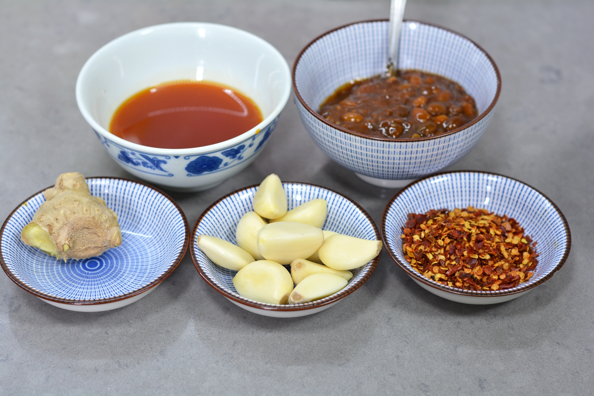 2. 主要调味料准备好:生抽蚝油混合均匀,黄豆酱半碗,根据具体的材料调整用量,姜、大蒜、辣椒粉准备好;