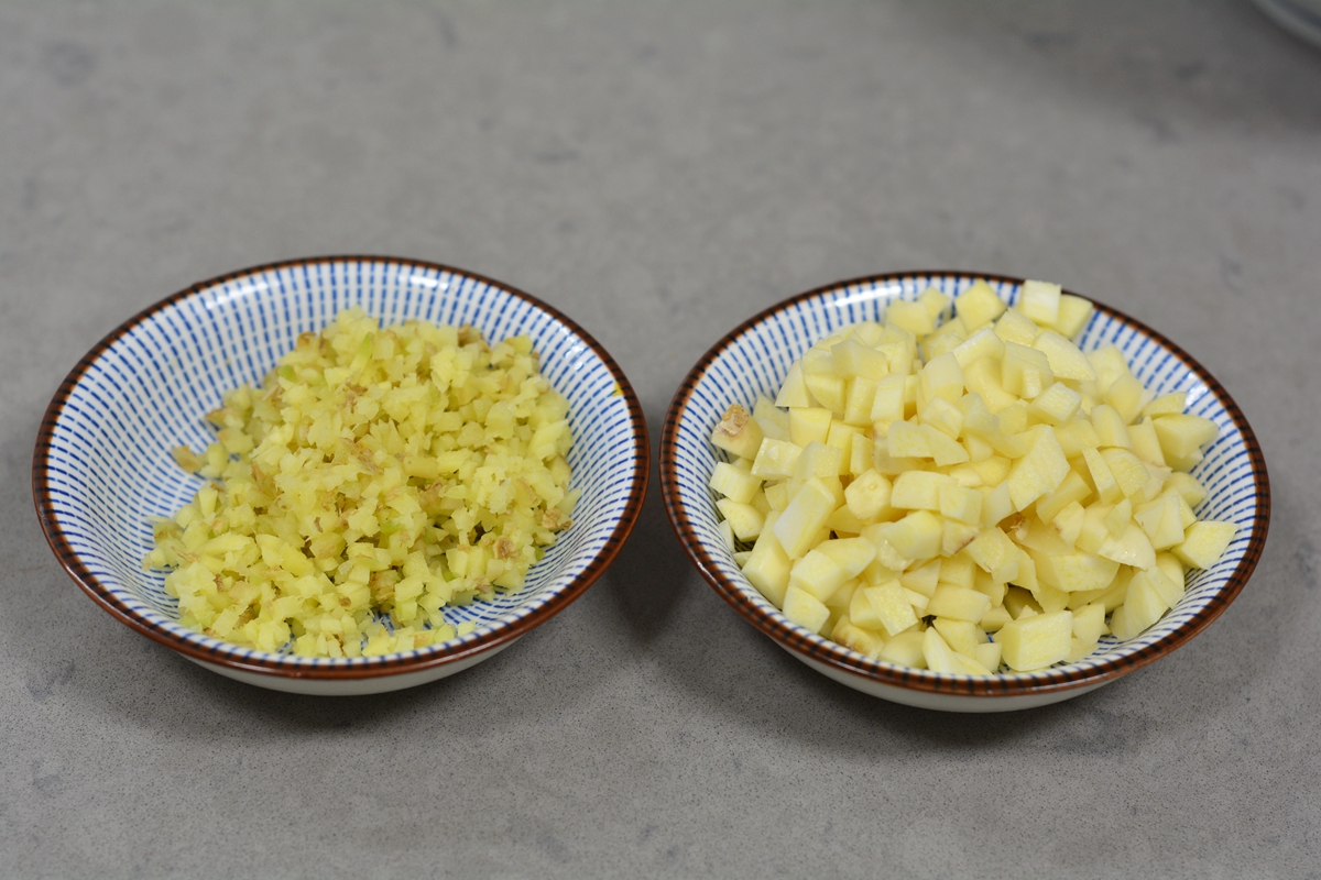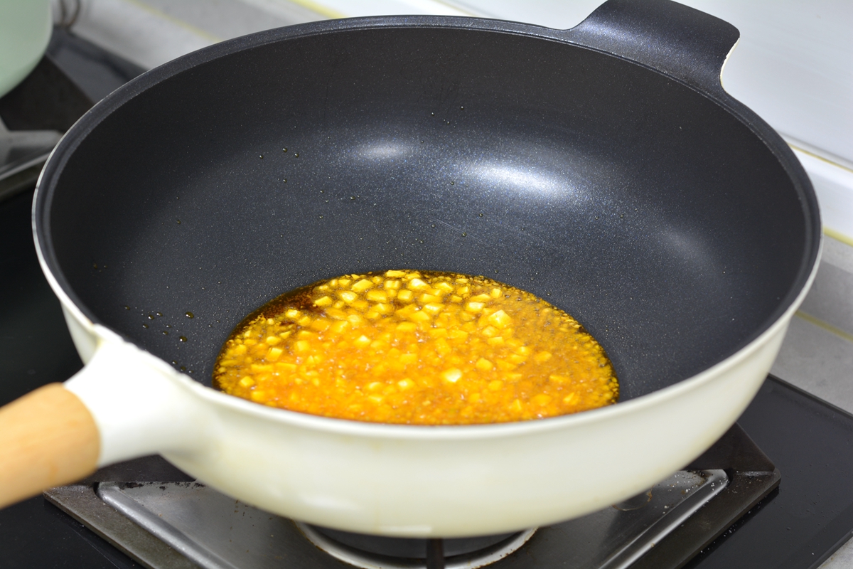 5. 炒锅中倒适量油,油量可以比炒菜时多一些,如果想要保存时间长一些,可以多放油;先将姜末和一半蒜丁煸炒出香味;