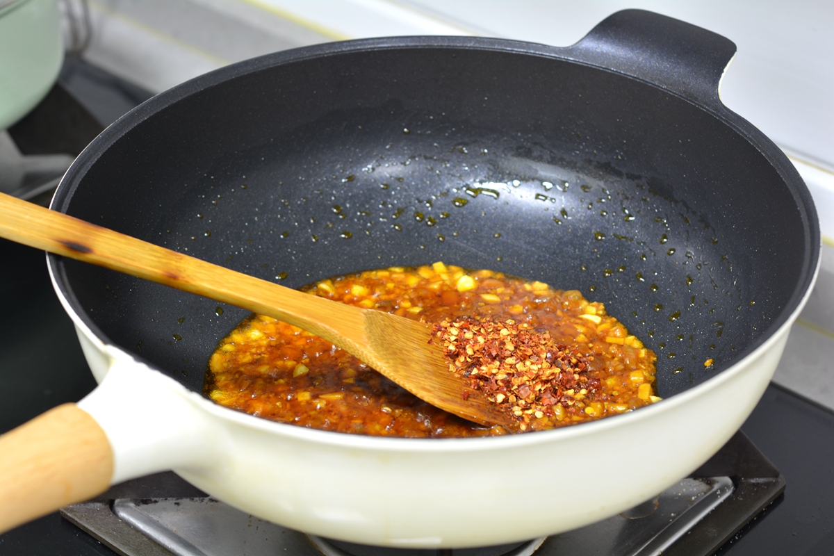 6. 倒入黄豆酱,小火熬出香味,将辣椒粉倒入其中,这时放辣椒粉可以熬出辣味,还不会炒糊;