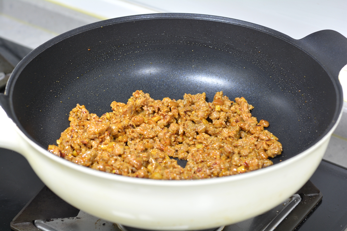 7. 将牛肉馅倒入锅中,翻炒变色;因为是肉馅,所以容易粘连在一起,因此炒的时候动作要快,尽量把肉馅划散;可将生抽蚝油融液倒入牛肉中,上色去腥;