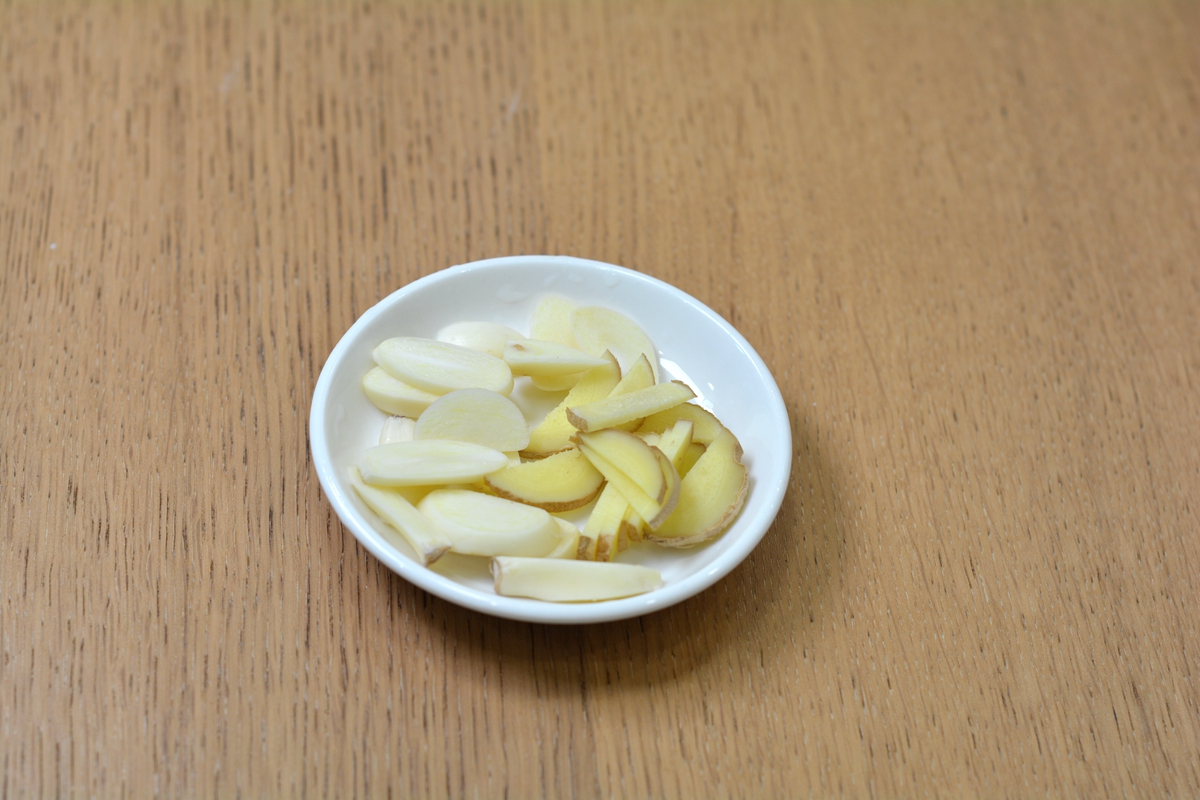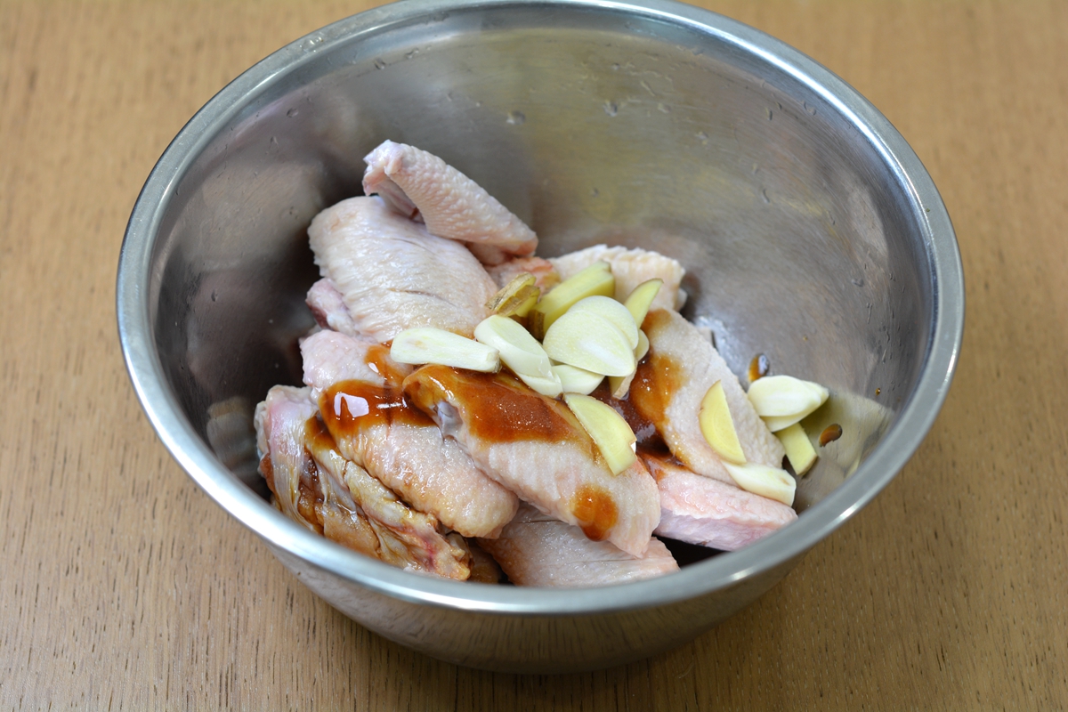 4. 用少许酱油、蚝油、料酒、白糖、盐、姜、大蒜、腌制鸡翅,用量没有固定的比例,白糖一点点用来提鲜,大蒜和姜切片;
