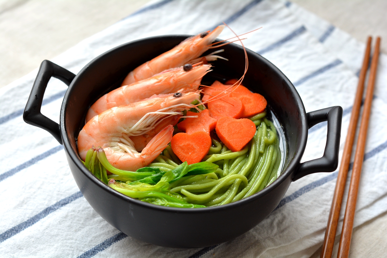 材料:面粉2杯,菠菜汁150克,大虾数只,鸡汤适量,胡萝卜,菠菜