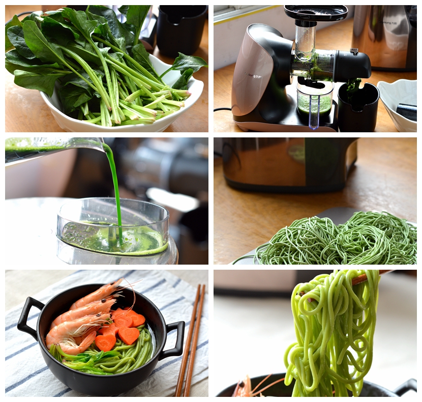 孩子不爱吃菜,我把菠菜榨汁,再和面轧面条。面条颜色漂亮又营养,柔软又筋道。再浇上清香的鸡汤、几只大虾、蔬菜,这碗面条好吃营养又健康。