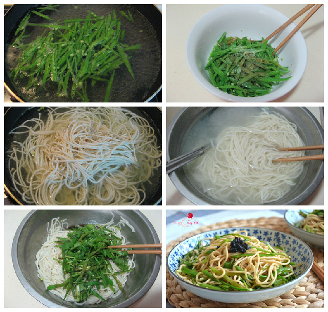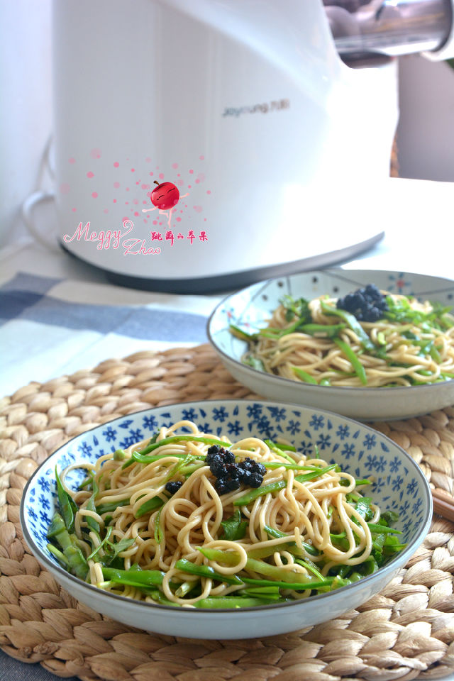 简单的做法、简单的调料,却成就了一顿美味的午餐。顺手浇上一勺自制的豆豉辣酱,吸足了料汁的细面条,筋道、滑爽,再配上脆脆的荷兰豆丝,好吃的停不下来!