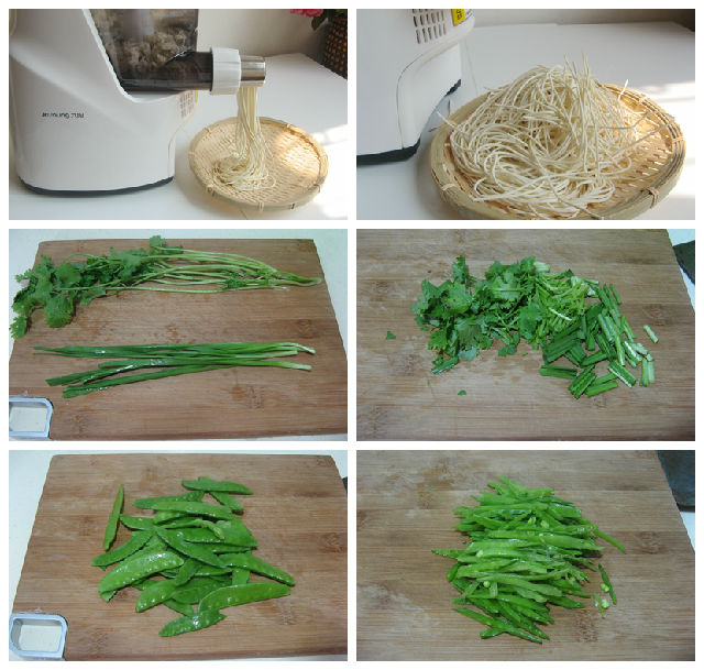 1. 面粉倒入面条机中,清水放入杯中,面条的工作完全交给面条机完成;