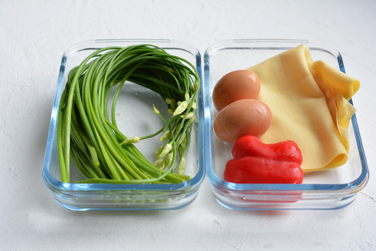 1. 韭薹去掉老根,清洗干净,豆腐皮、红椒清洗干净;鸡蛋准备好;