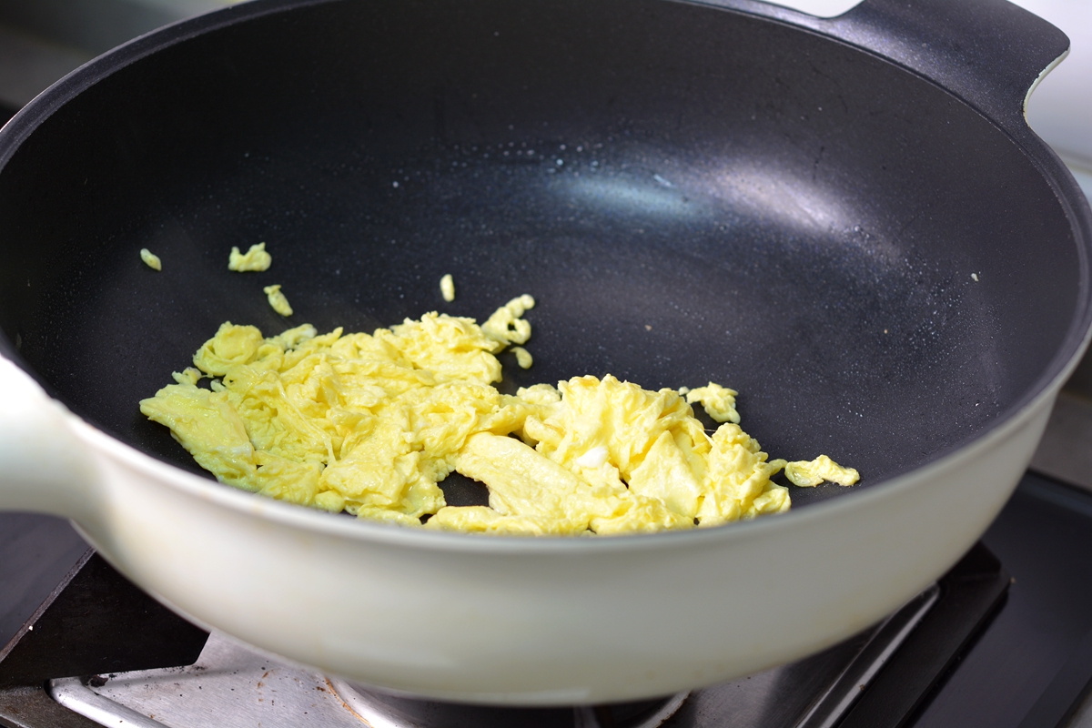 3. 不粘炒锅中倒适量油,油8成热时将鸡蛋液倒入锅中,稍稍凝固时用铲子划散;