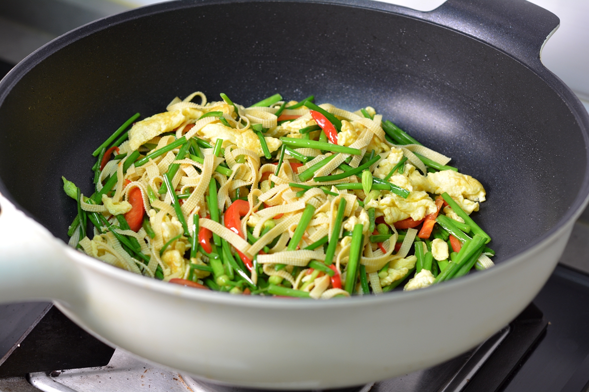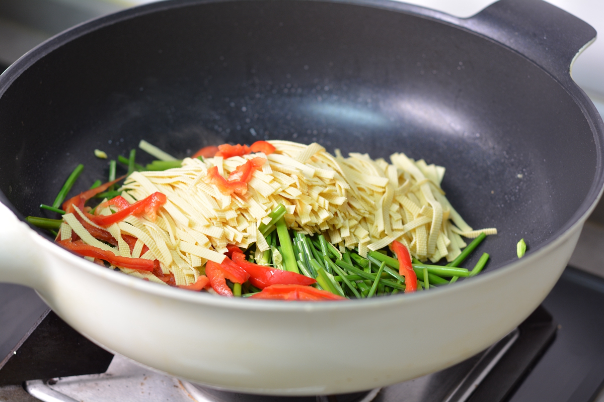 4. 将韭薹、红椒、豆腐丝一同倒入锅中;
