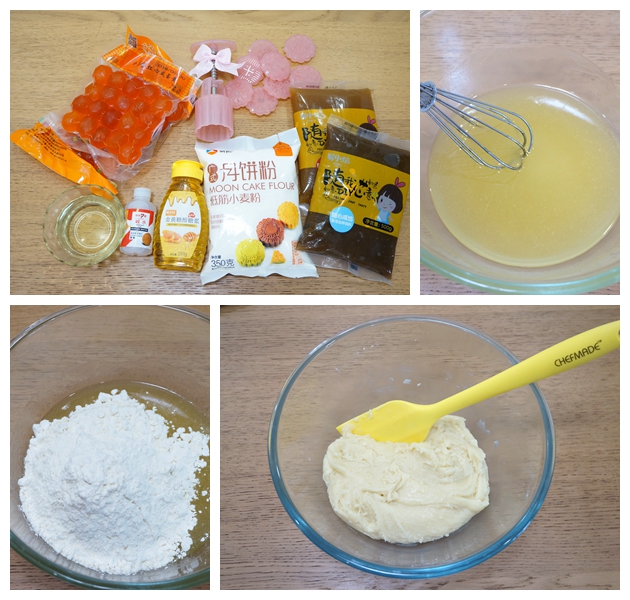 1. 广式月饼原料准备好:我用的易小焙广式月饼粉、金黄糖浆、甜馅,金奇香小号咸蛋黄,学厨的50克月饼模具;