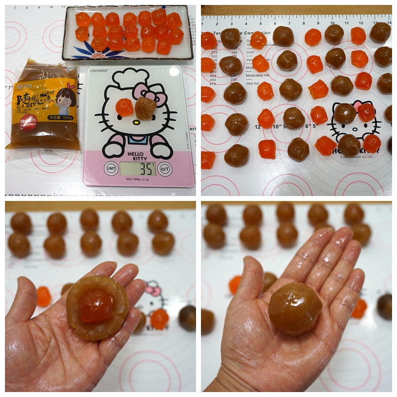 5. 咸蛋黄和豆沙一起称重,每份35克,;