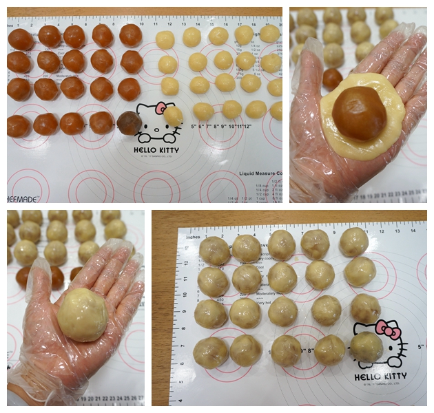 9. 20个蛋黄全部包好;再将饼皮称重15克*20个;