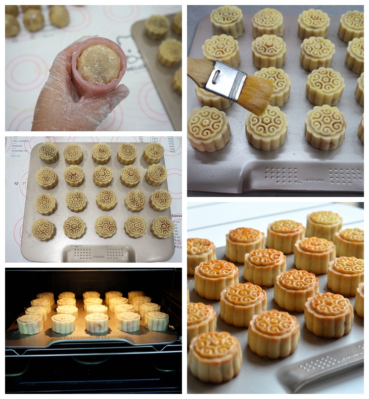 14. 将月饼按压在不粘烤盘上,不要太用力,因为饼皮很柔软,轻轻一压就会出现明显的纹路了;