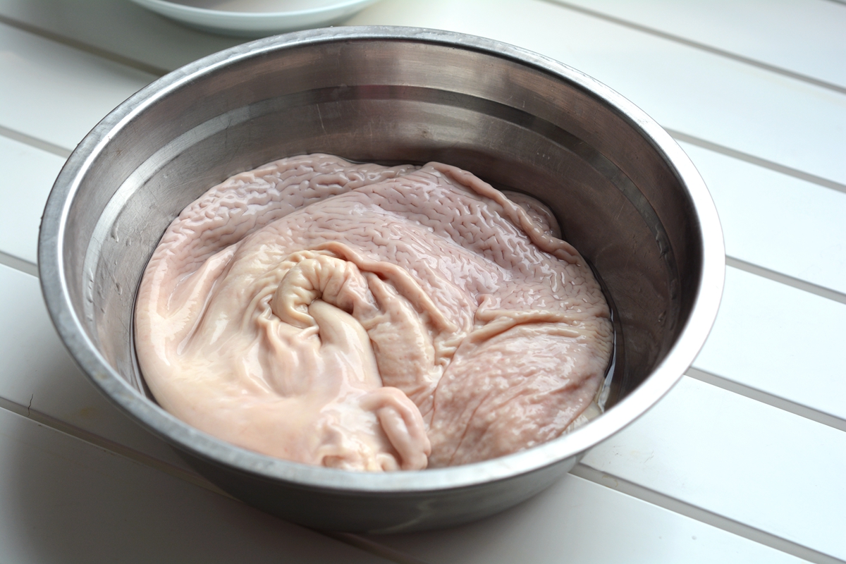 将猪肚切长宽条;
