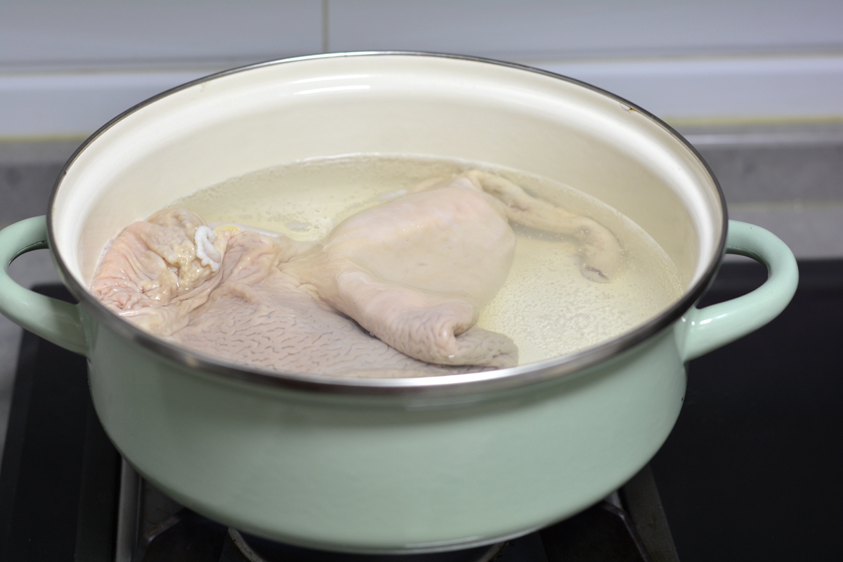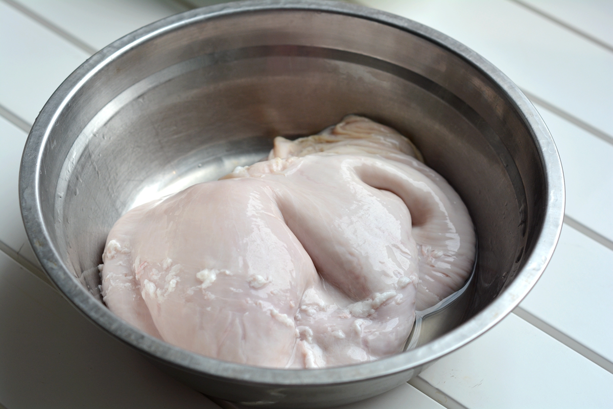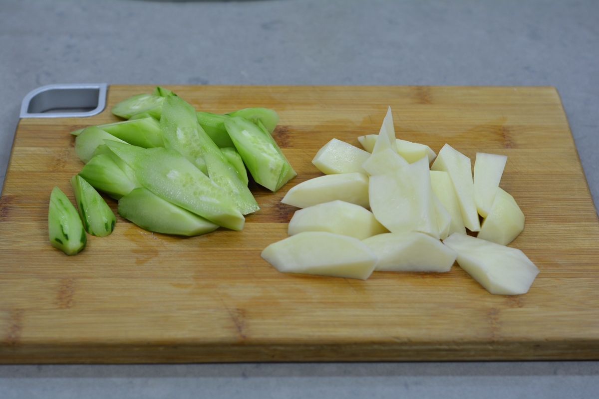 材料:猪肚1个,土豆1个,黄瓜1根,大蒜4瓣,姜4片,盐少许,香葱少许