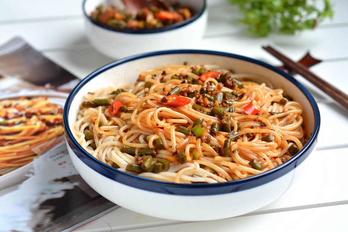 【肉末酸豆角拌米粉】