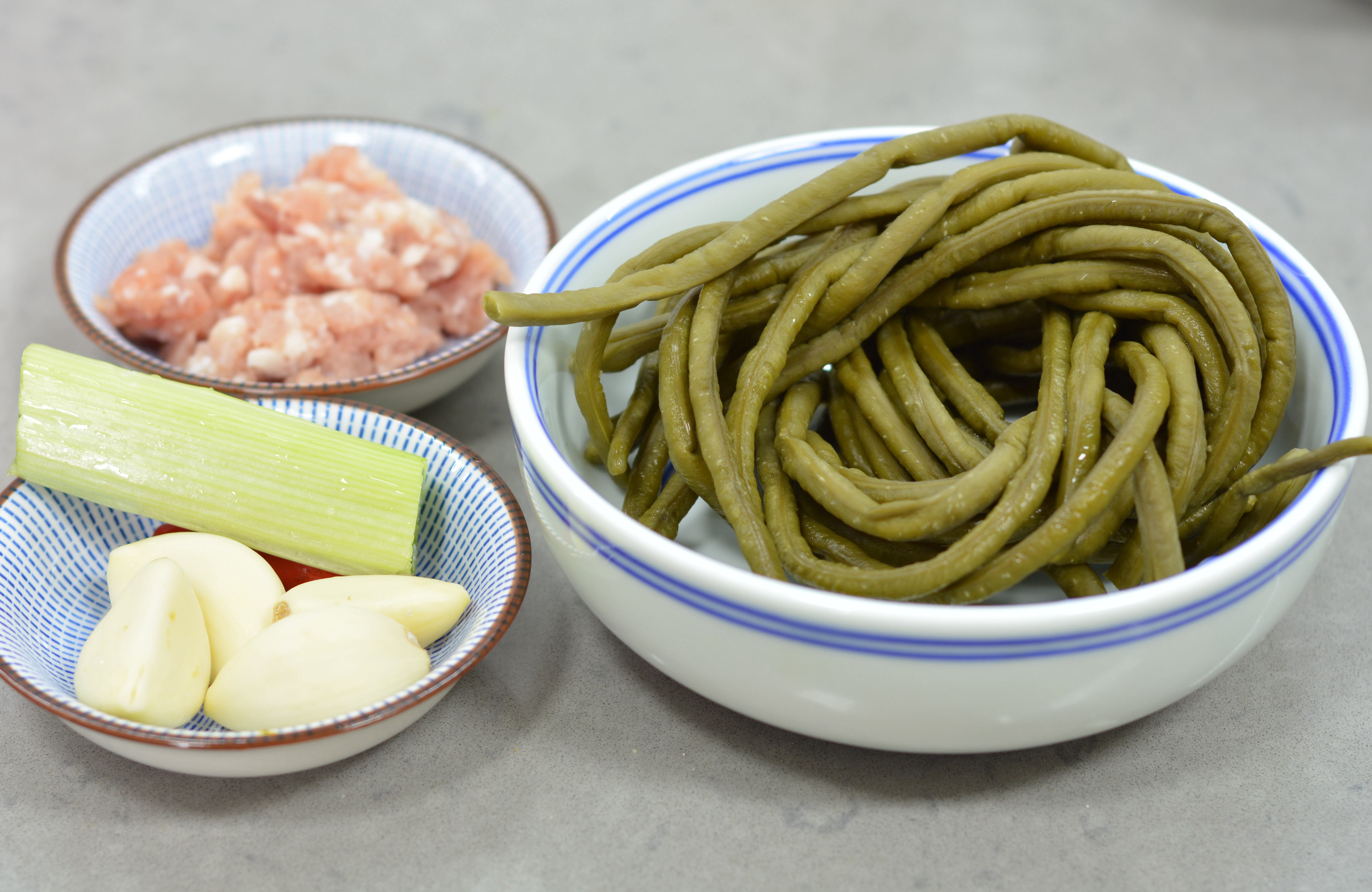 2. 酸豆角是自家腌制的,方法如下:新鲜豇豆洗净沥干水后,入凉开水或者纯净水的净坛中,放盐、白酒、干辣椒、花椒、姜、大蒜同腌,坛口是水密封的,约过10天半个月就可变酸,取时用无油净筷夹取。