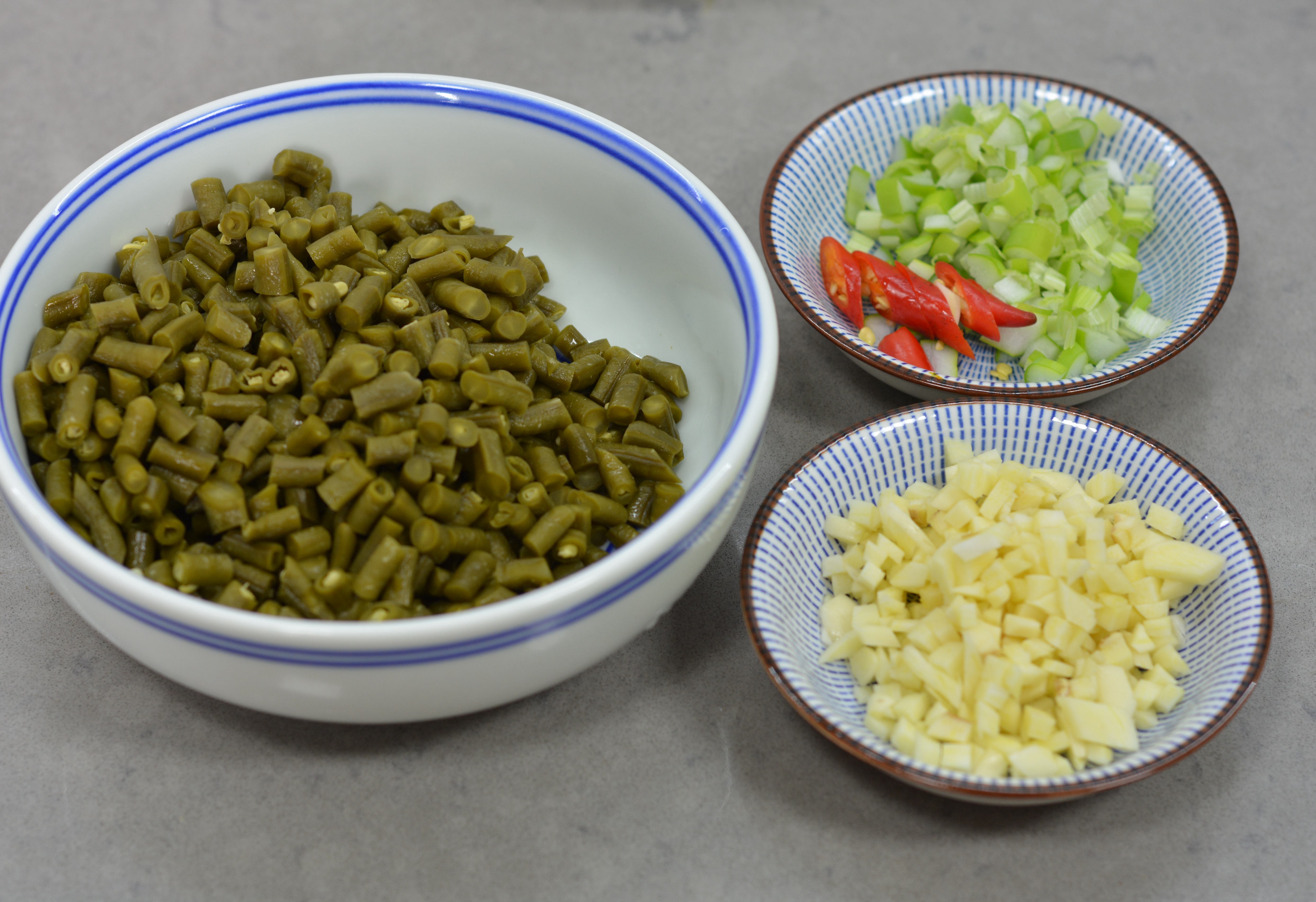 3. 酸豆角切1公分长的小段,大蒜切粒,大葱切末,朝天椒切小圈;