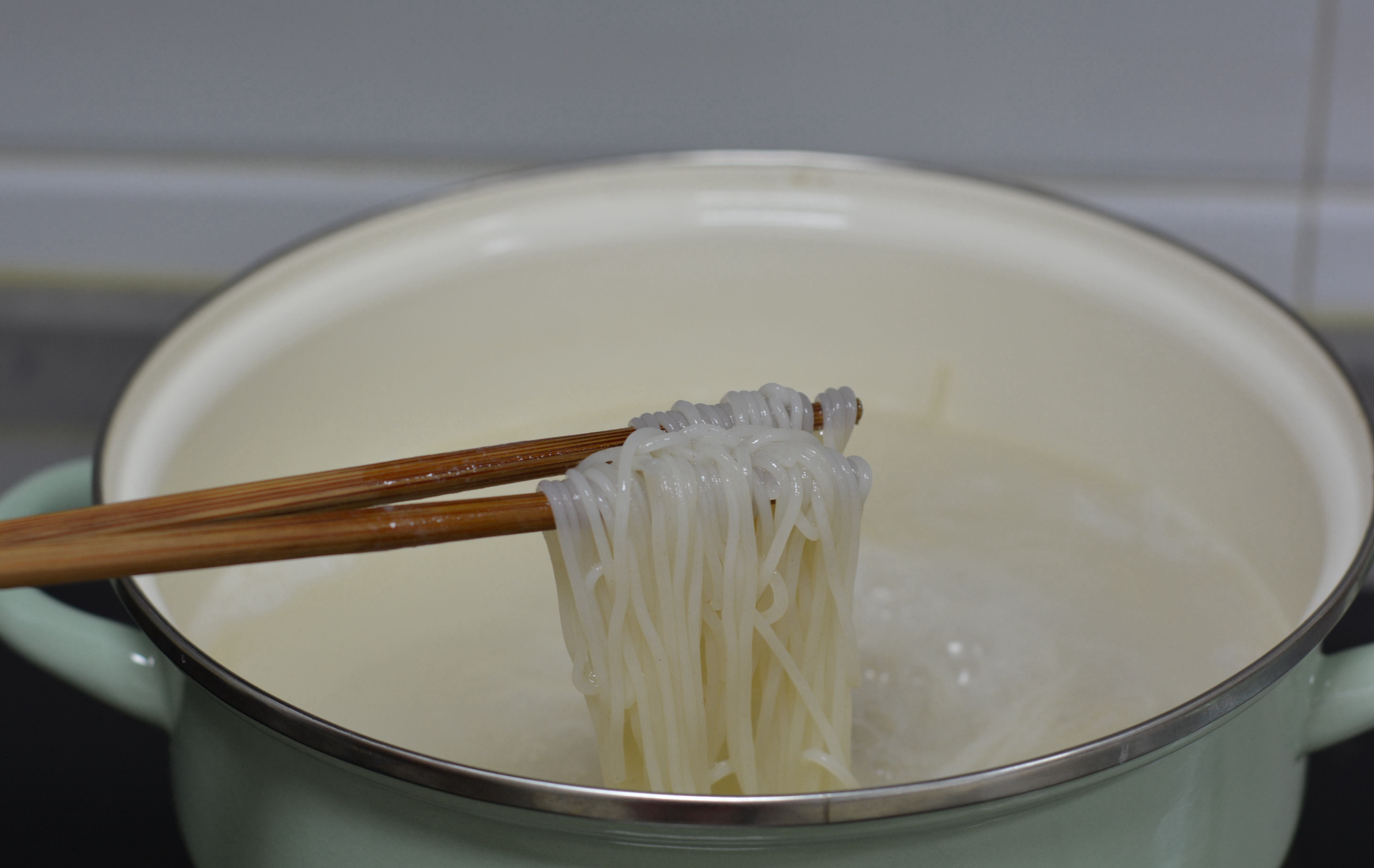 1. 我用的江西干米粉,有两种方法将其变软,一是凉水泡软后凉水煮开捞出过凉水;另一种是干粉直接入凉水锅中,不时地搅拌防粘连,煮开后关火,焖至柔软。