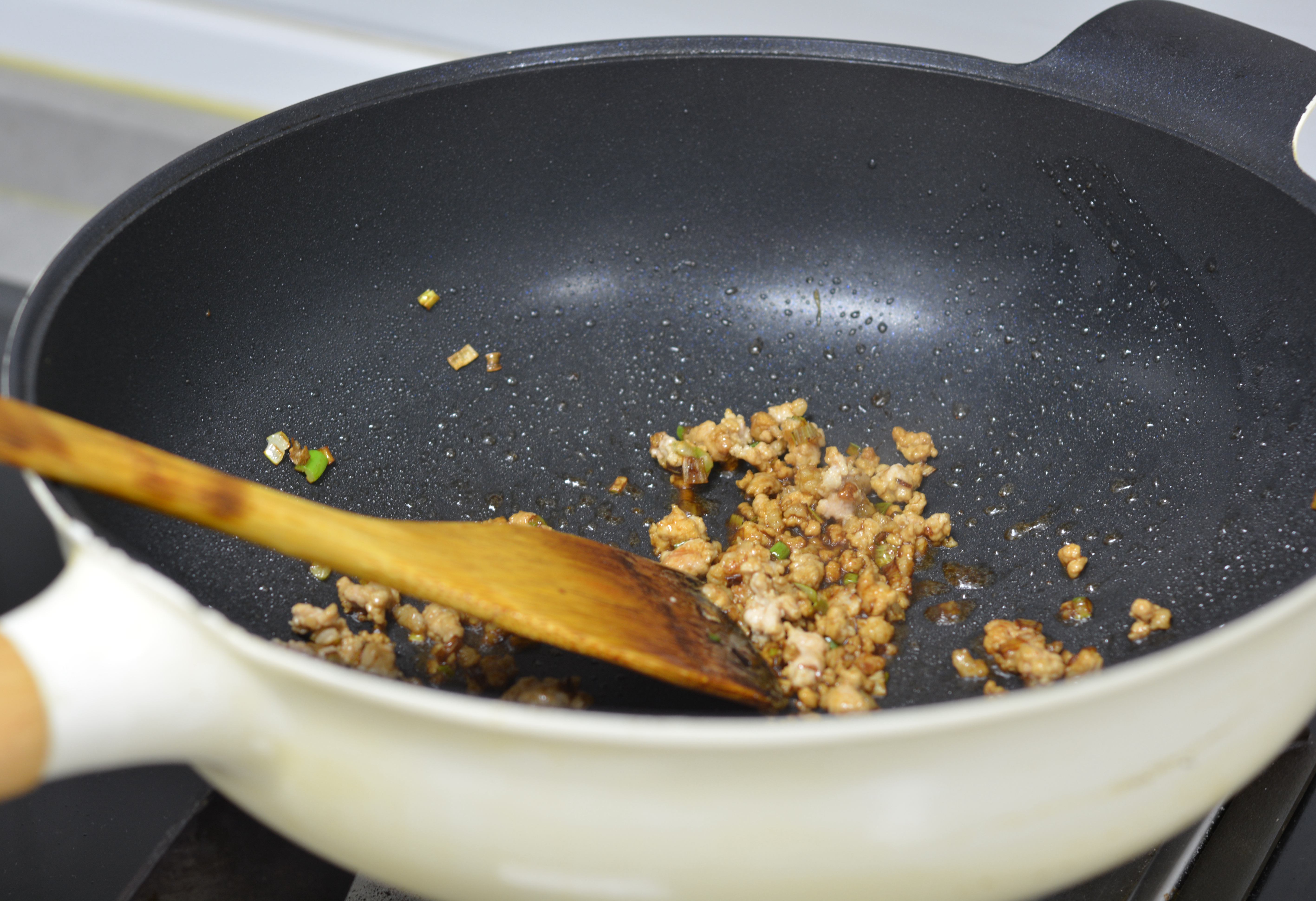 5. 九阳轻奢炒锅中倒适量油,将葱花煸炒出香味儿,肉馅倒入锅中,迅速划散变色后倒少许料酒、酱油调色;