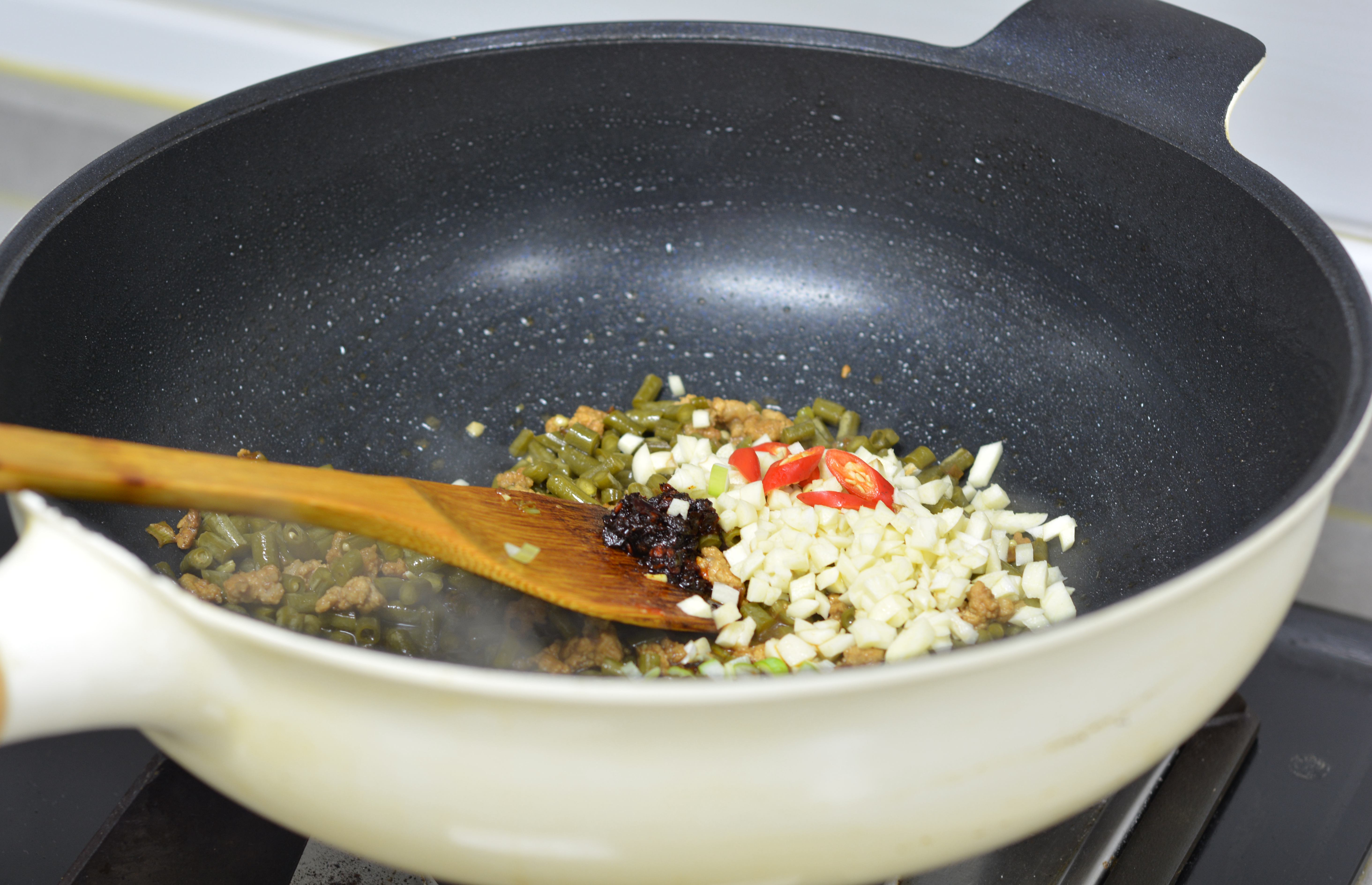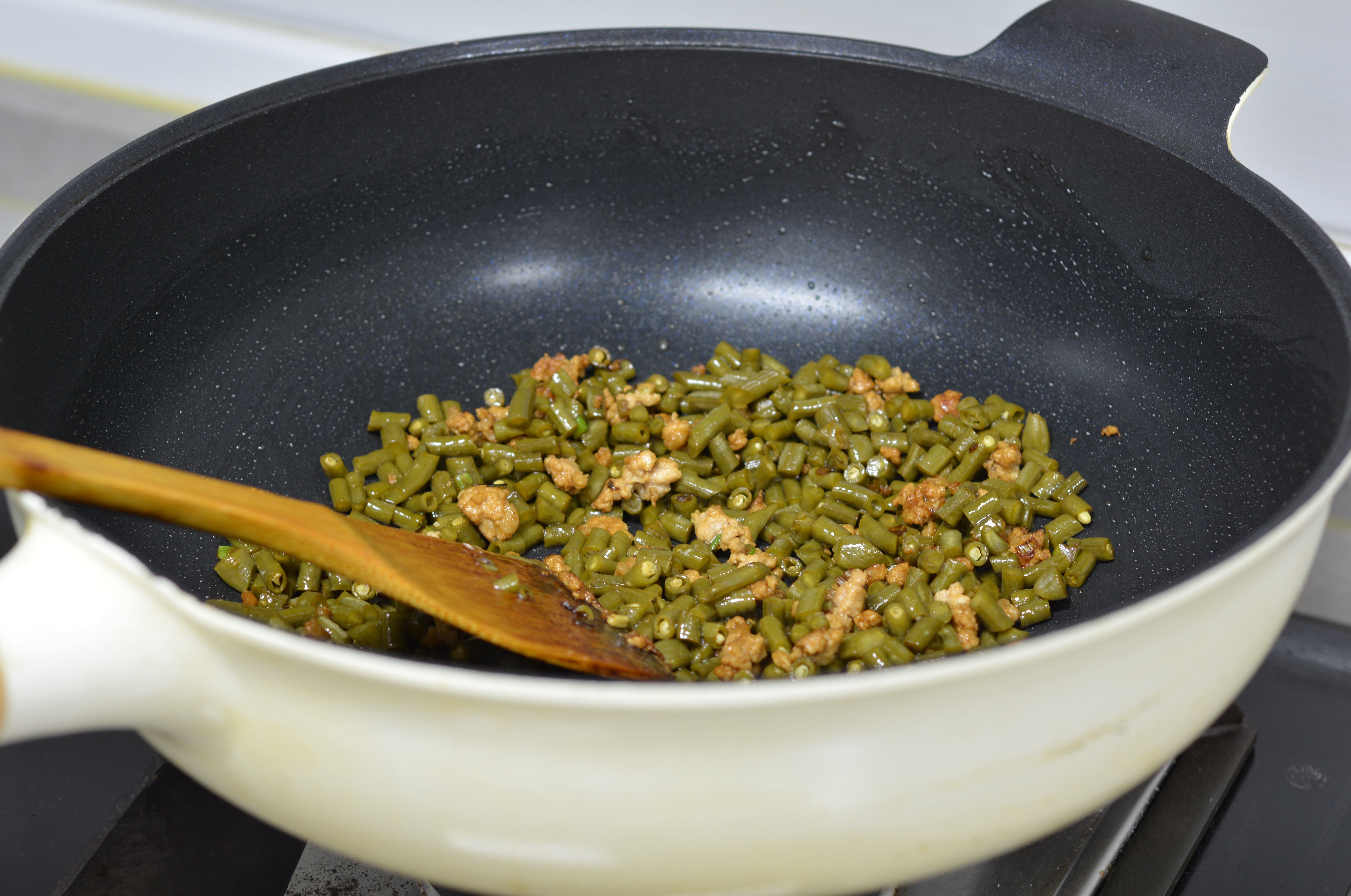 6. 将酸豆角倒入锅中翻炒2分钟,可淋少许水,豆角更快成熟而且不干;