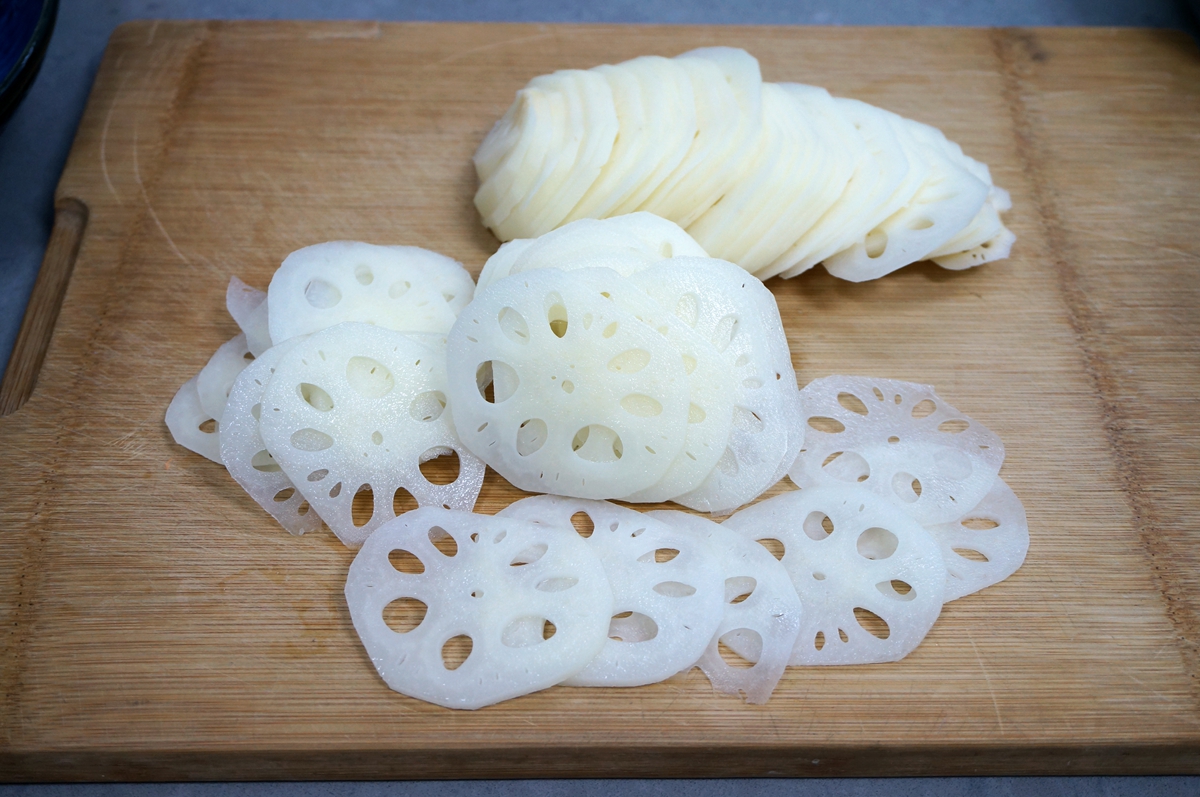 2. 莲藕放在案板上,用利刀切成薄约1毫米的片,越薄越好,考虑你刀功的时候到了;