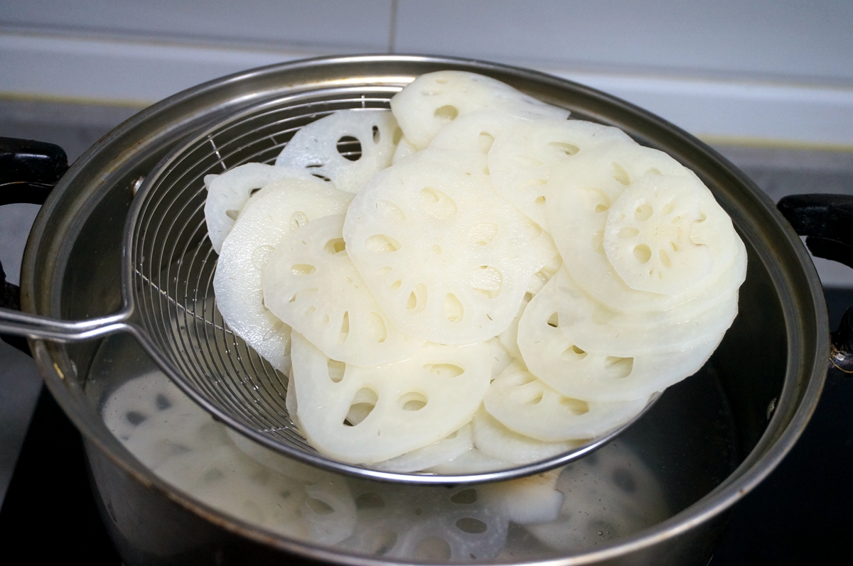 4. 藕片在开水锅里煮变色,捞出,充分过凉水,可保持脆嫩口感;