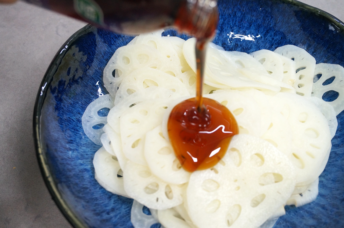 7. 再倒点白米醋,用白醋也成,只是白醋的口感比白米醋的更烈一些;不要用深色的醋,会影响藕片的色相;