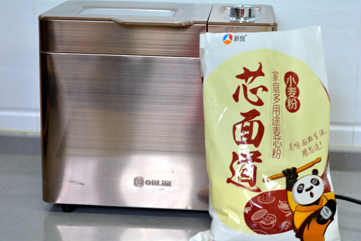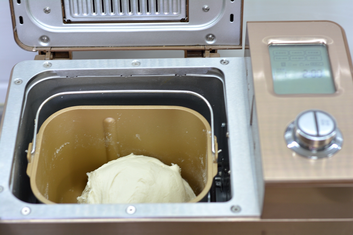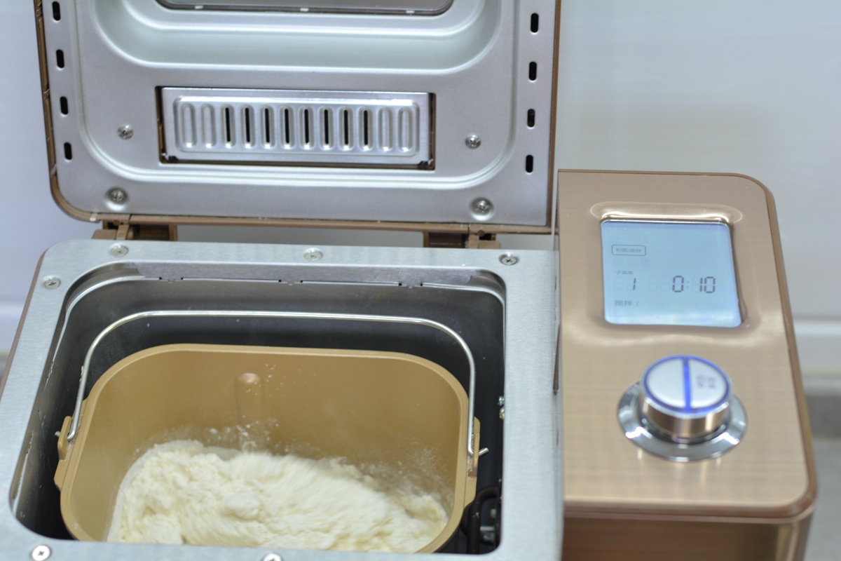 将面粉倒入面包桶中,凉水是面粉量的60%左右,将面包桶安装进东菱6D面包机中,启动一个揉面程序10分钟;