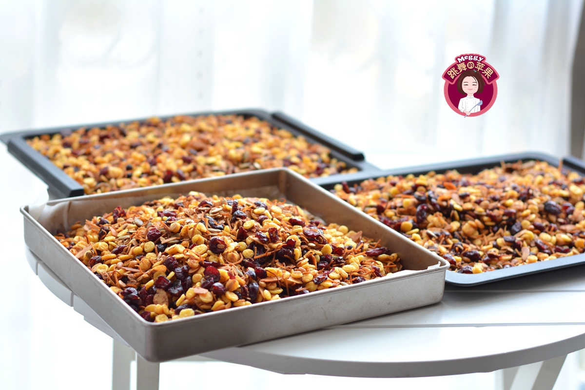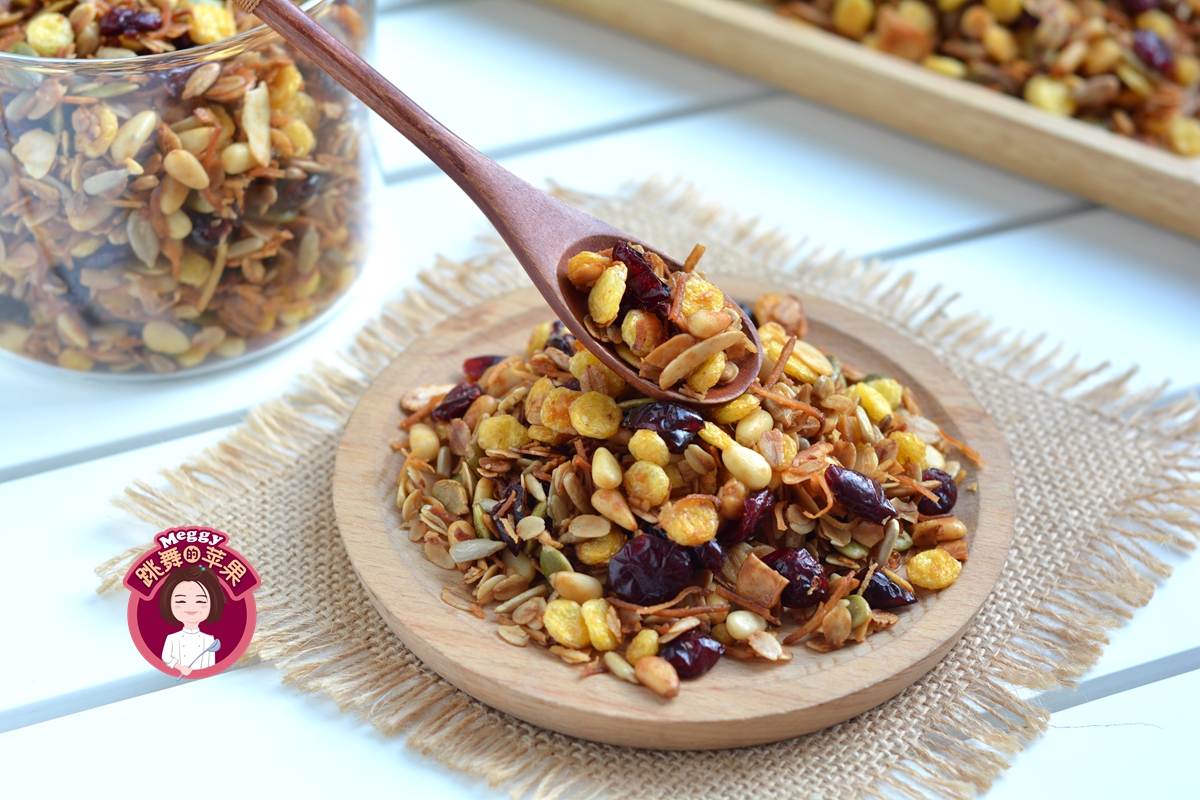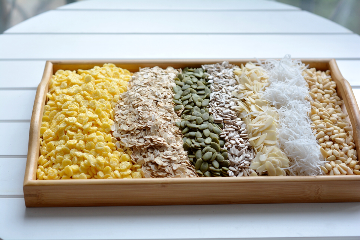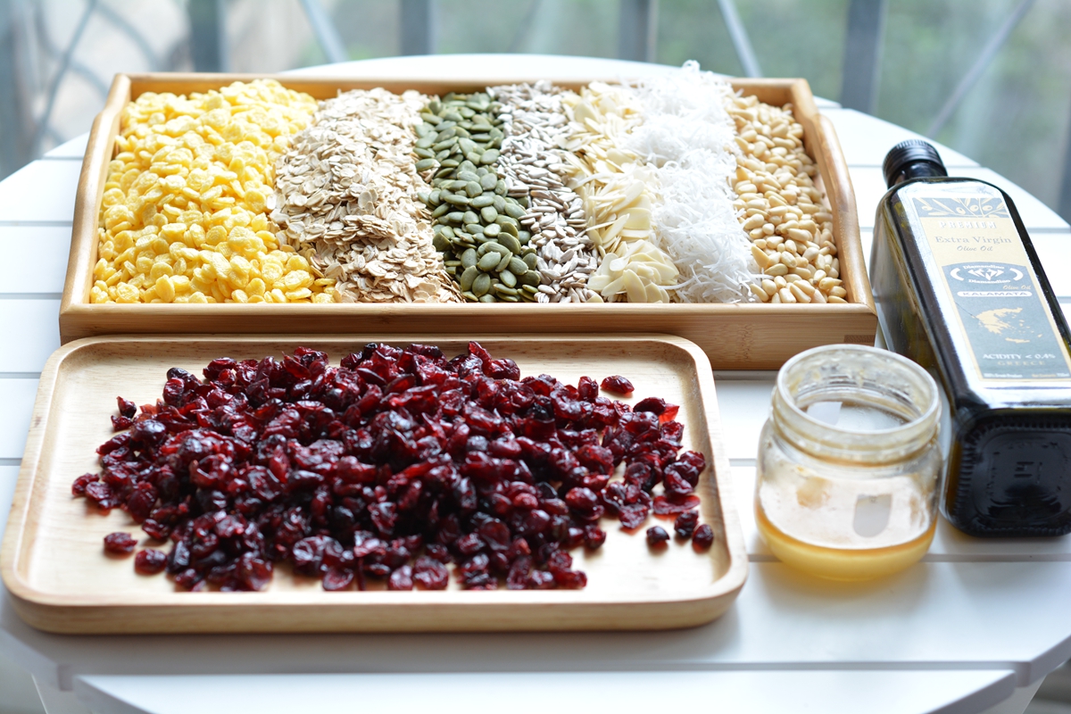 材料:生燕麦片200克,玉米片200克,生南瓜籽仁150克,生葵花籽仁1500克,生杏仁片150克,椰丝150克,松子仁150克,蔓越莓干300克,蜂蜜80克,橄榄油60克(可用椰子油代替)
