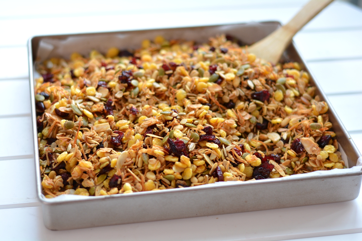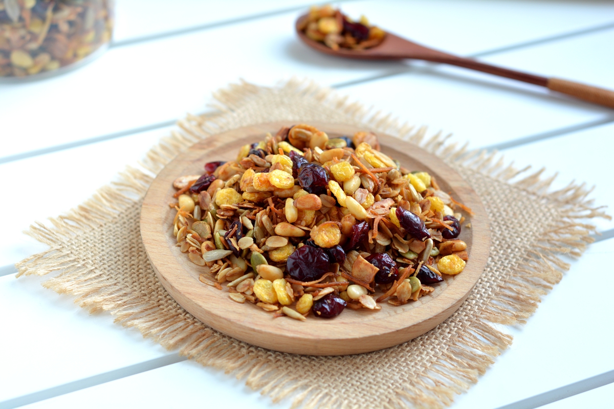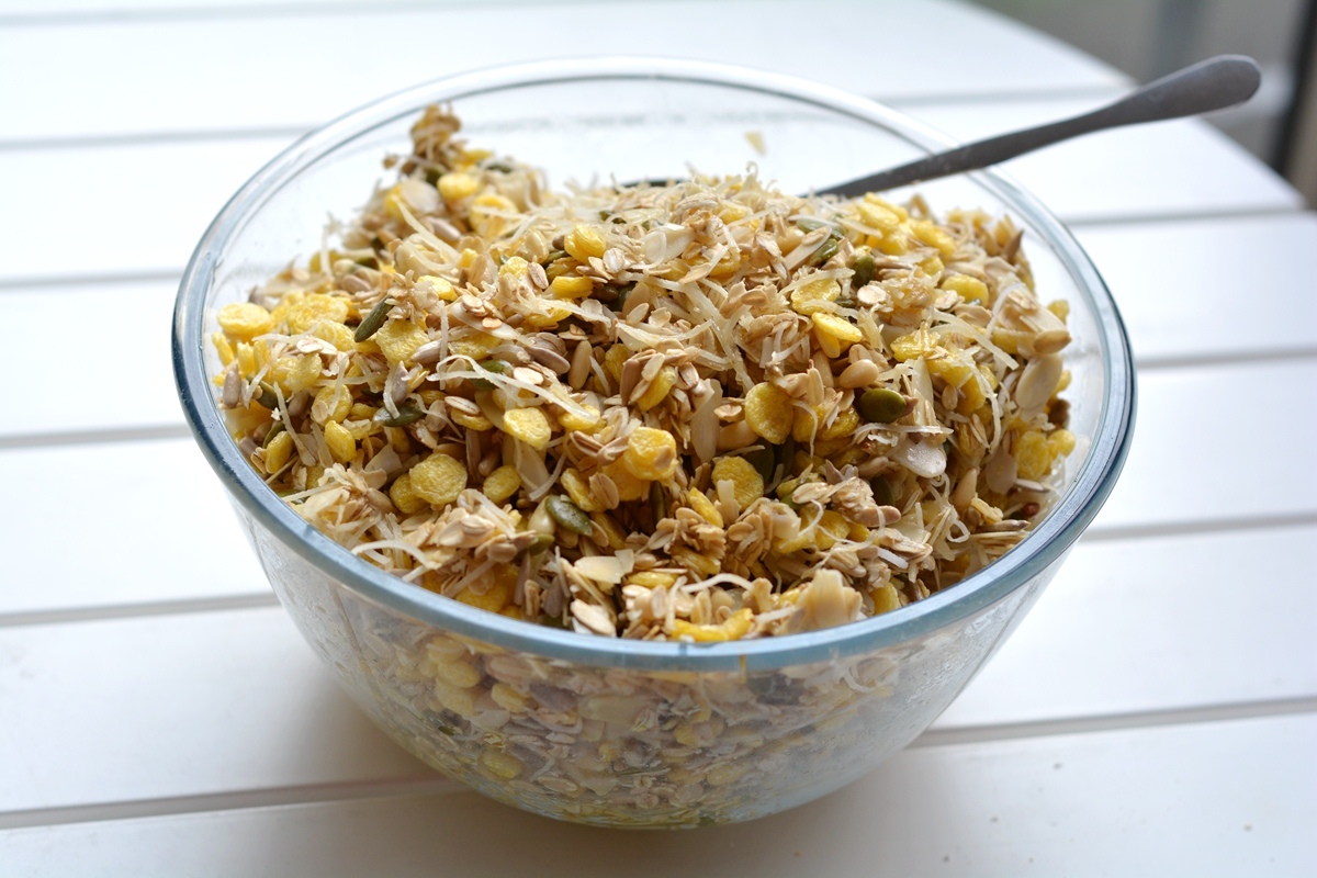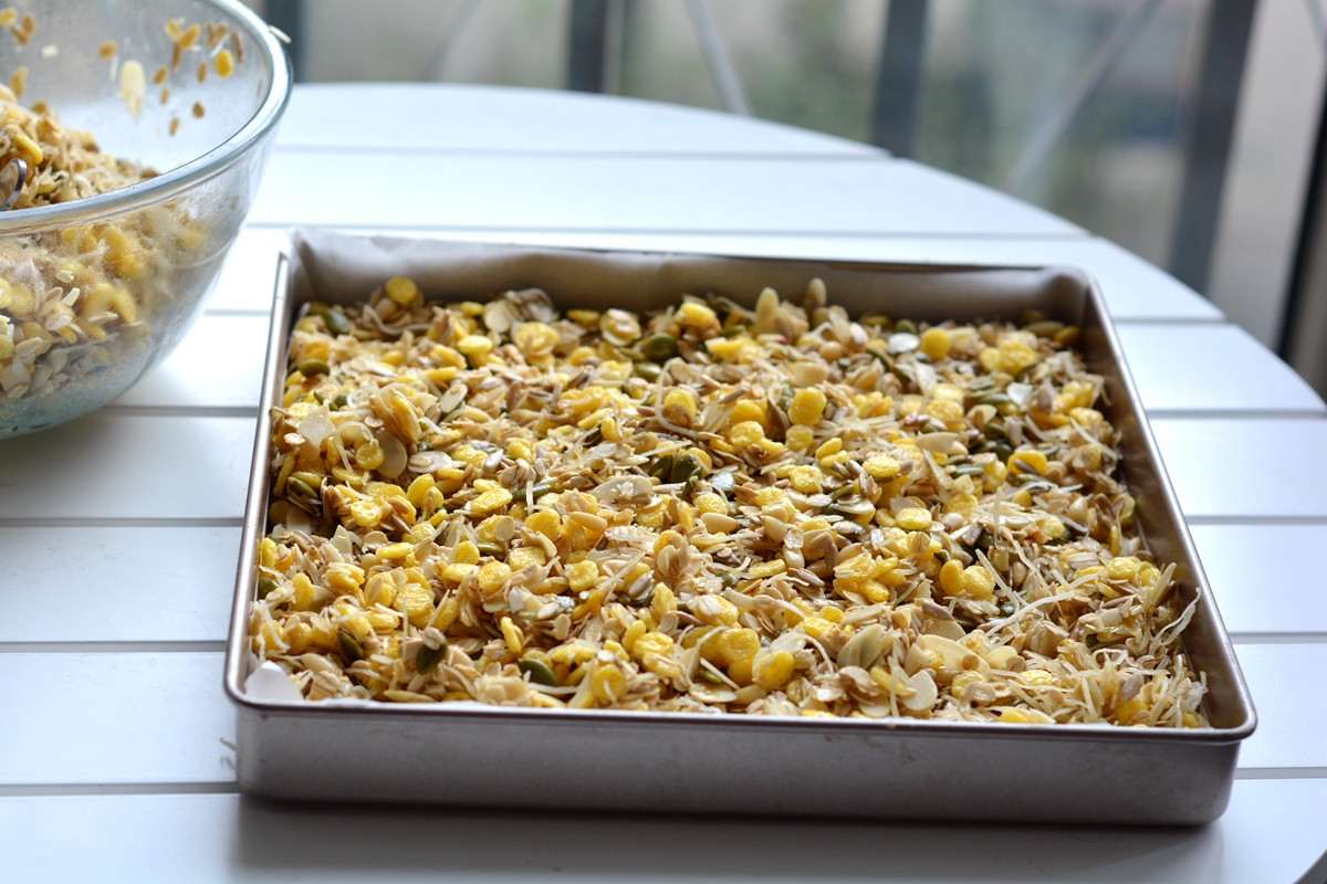 材料:生燕麦片200克,玉米片200克,生南瓜籽仁150克,生葵花籽仁1500克,生杏仁片150克,椰丝150克,松子仁150克,蔓越莓干300克,蜂蜜80克,橄榄油60克(可用椰子油代替)