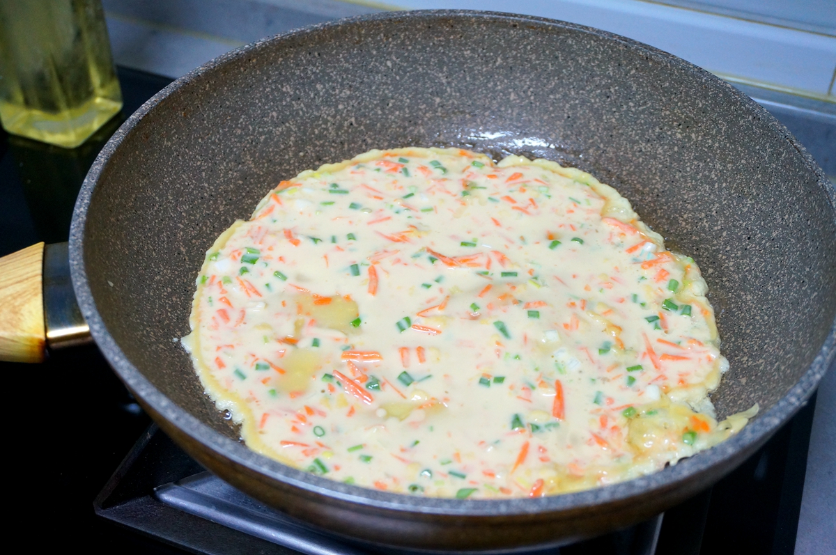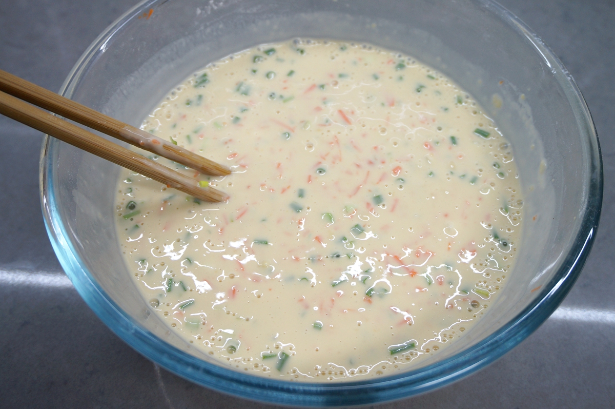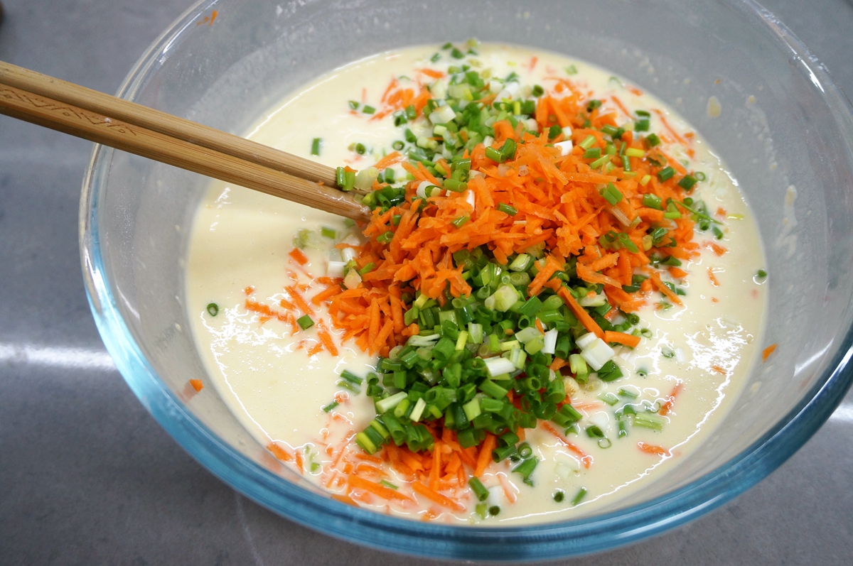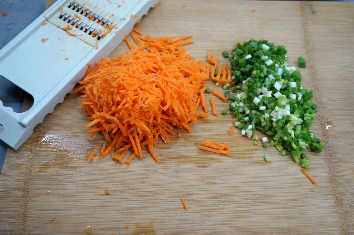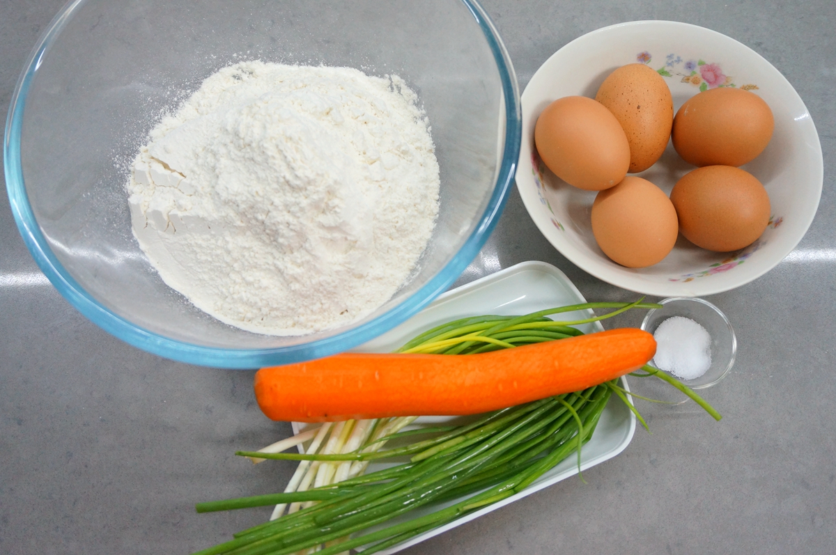 材料:鸡蛋5个,面粉1碗,胡萝卜1根,香葱1把,盐适量,凉水适量,油少许