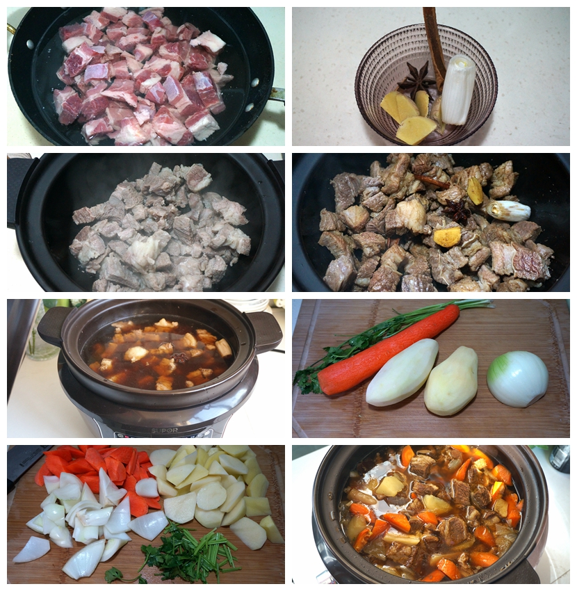 材料:牛腩1000克,土豆两个,胡萝卜一根,洋葱半个,香菜两棵,八角一个,鲜姜一块,桂皮一块,大葱一小段,酱油,盐