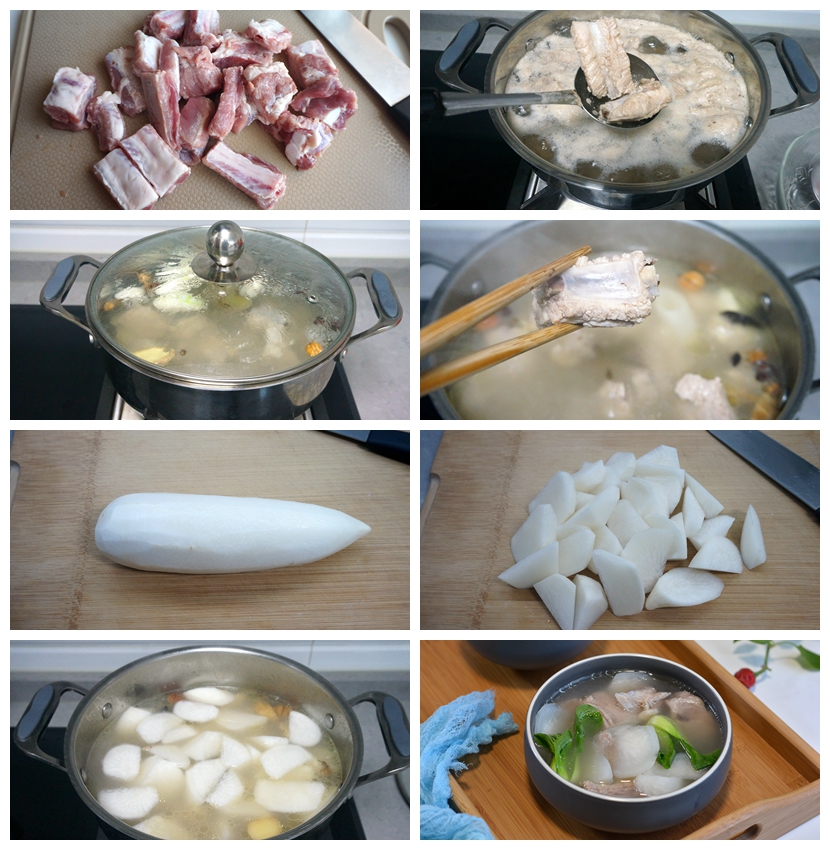 6. 将白萝卜块入排骨汤中,加盐,再煮10分钟左右,出锅前放几棵油菜芯更漂亮,如果有香葱撒一点,还能增色提香。