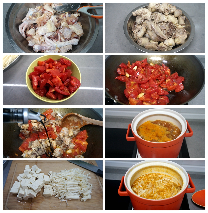 材料:1斤多重小鸡1只,西红柿2个,豆腐1块,金针菇1把,大蒜1头,生抽,酱油,盐,香葱
