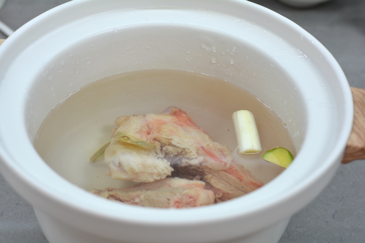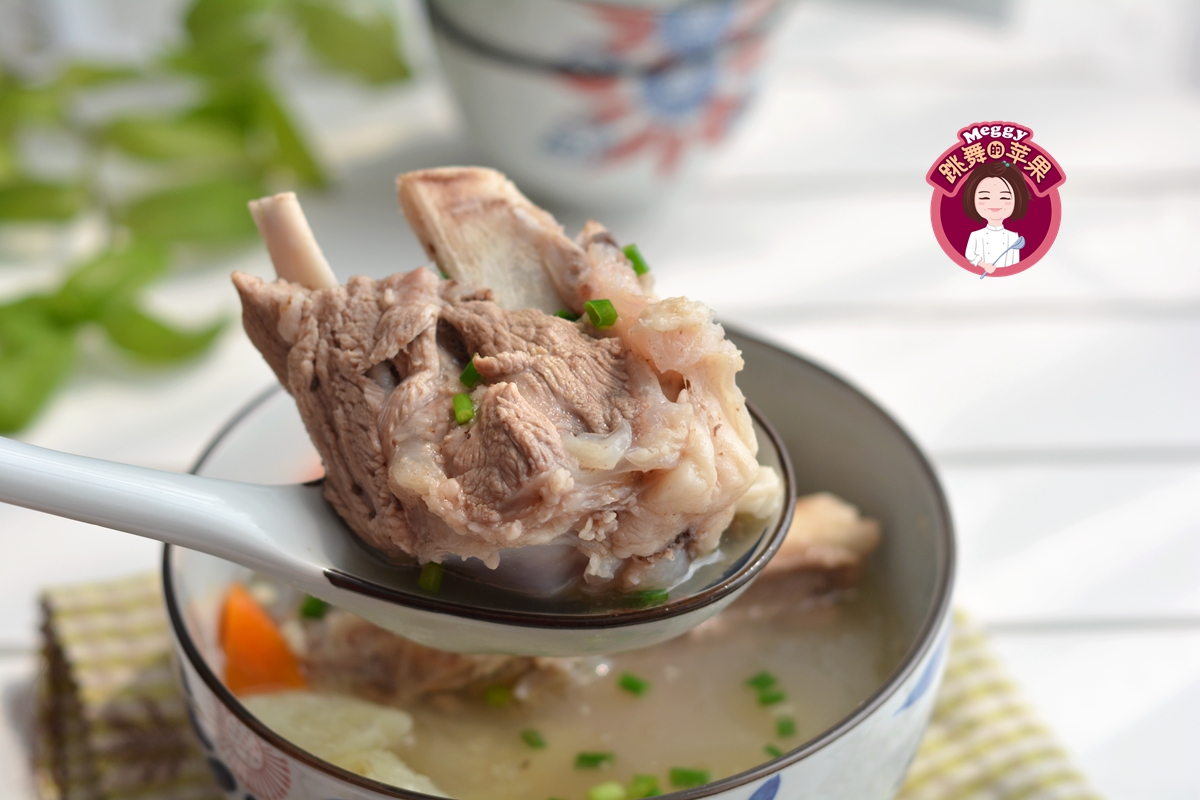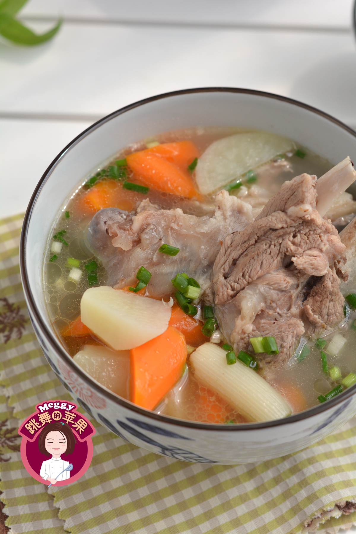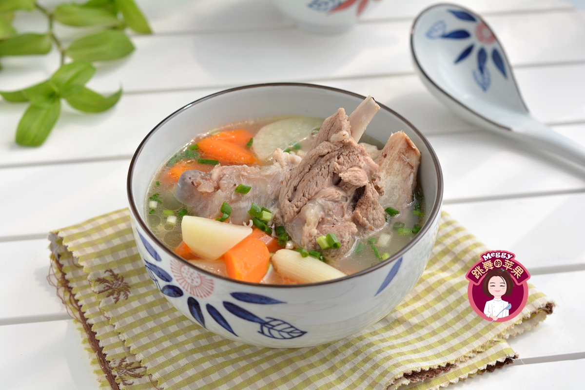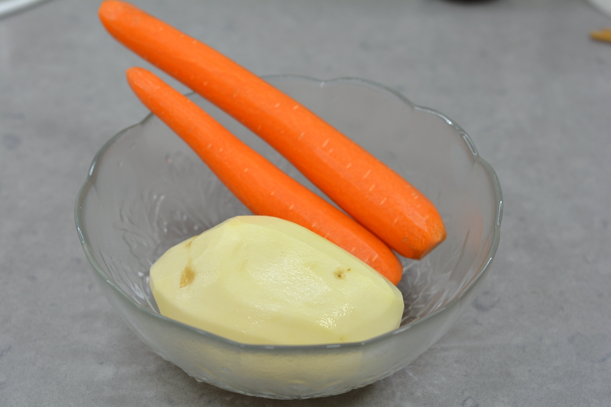 材料:肉骨2块,土豆1个,胡萝卜2根,姜1小块,香葱适量,盐少许,热水适量