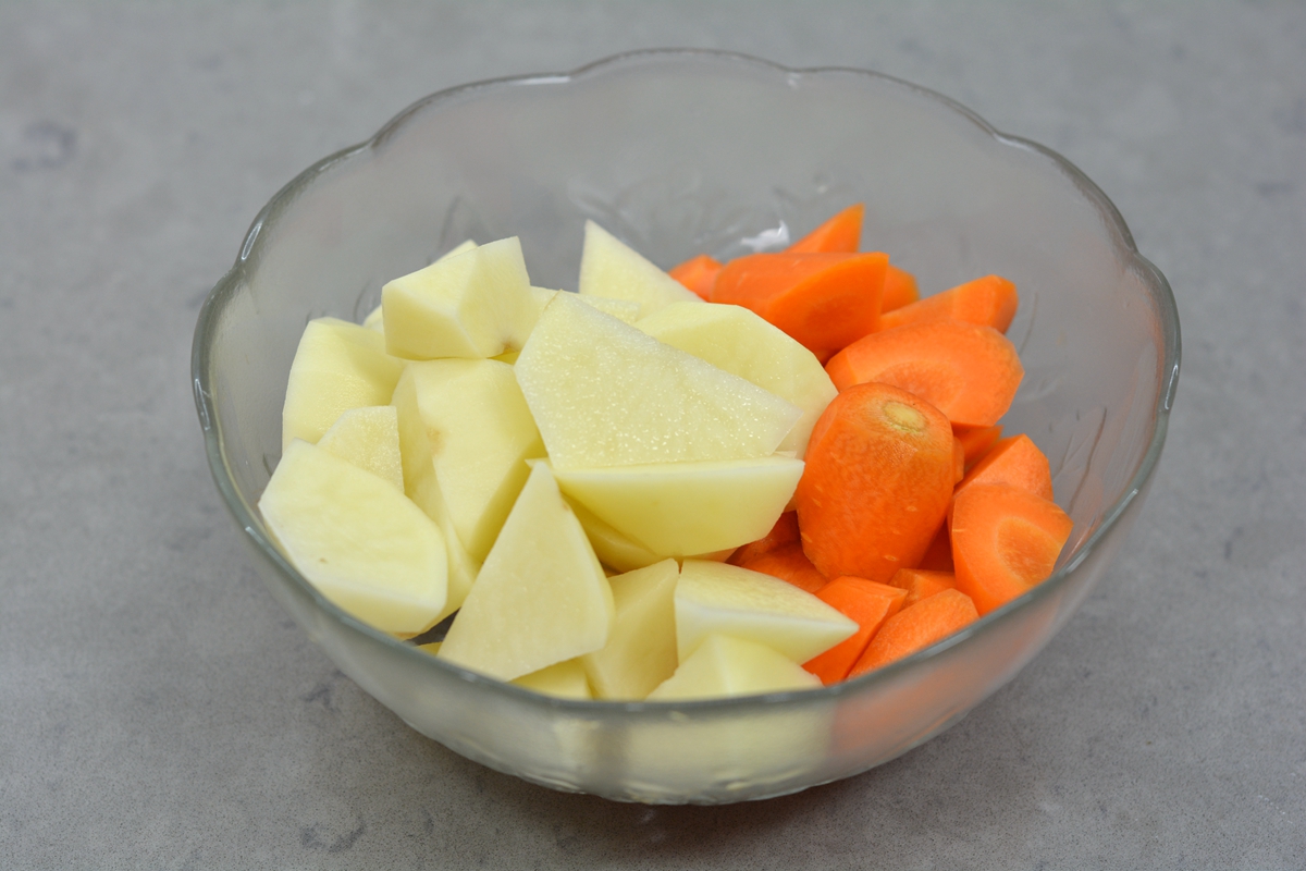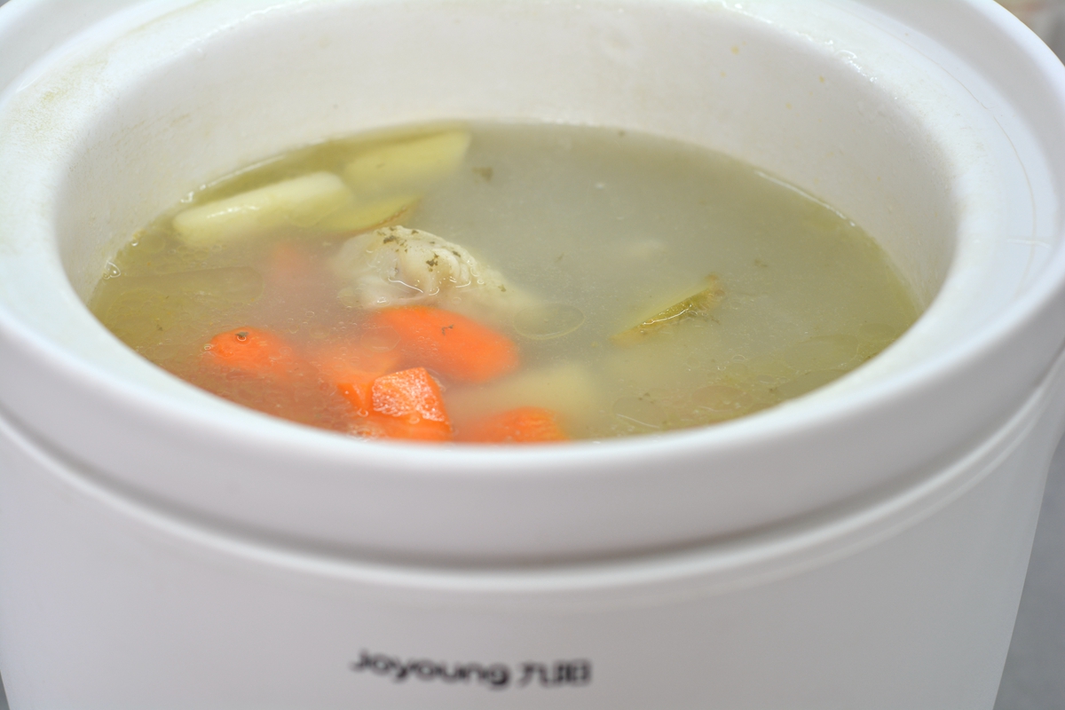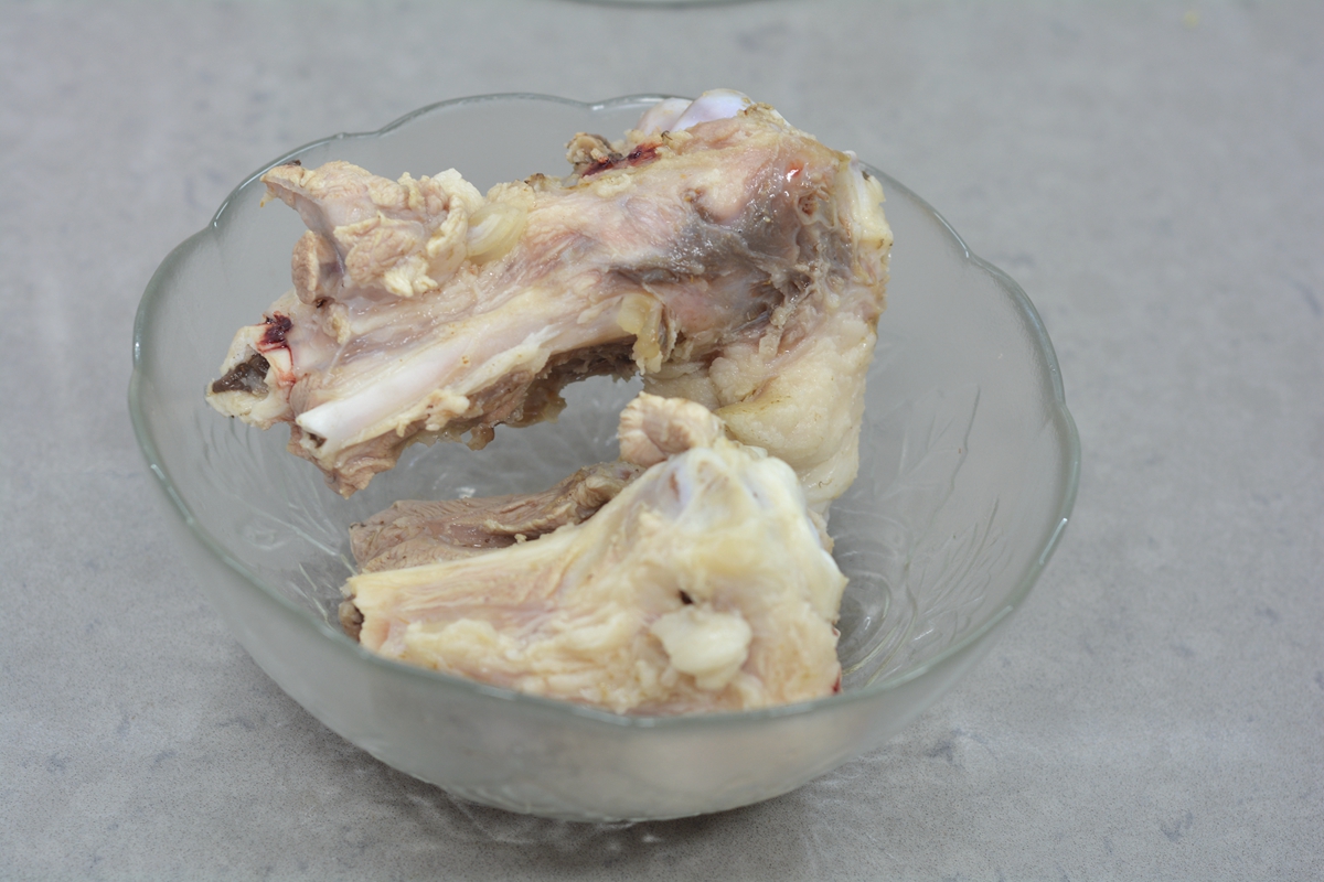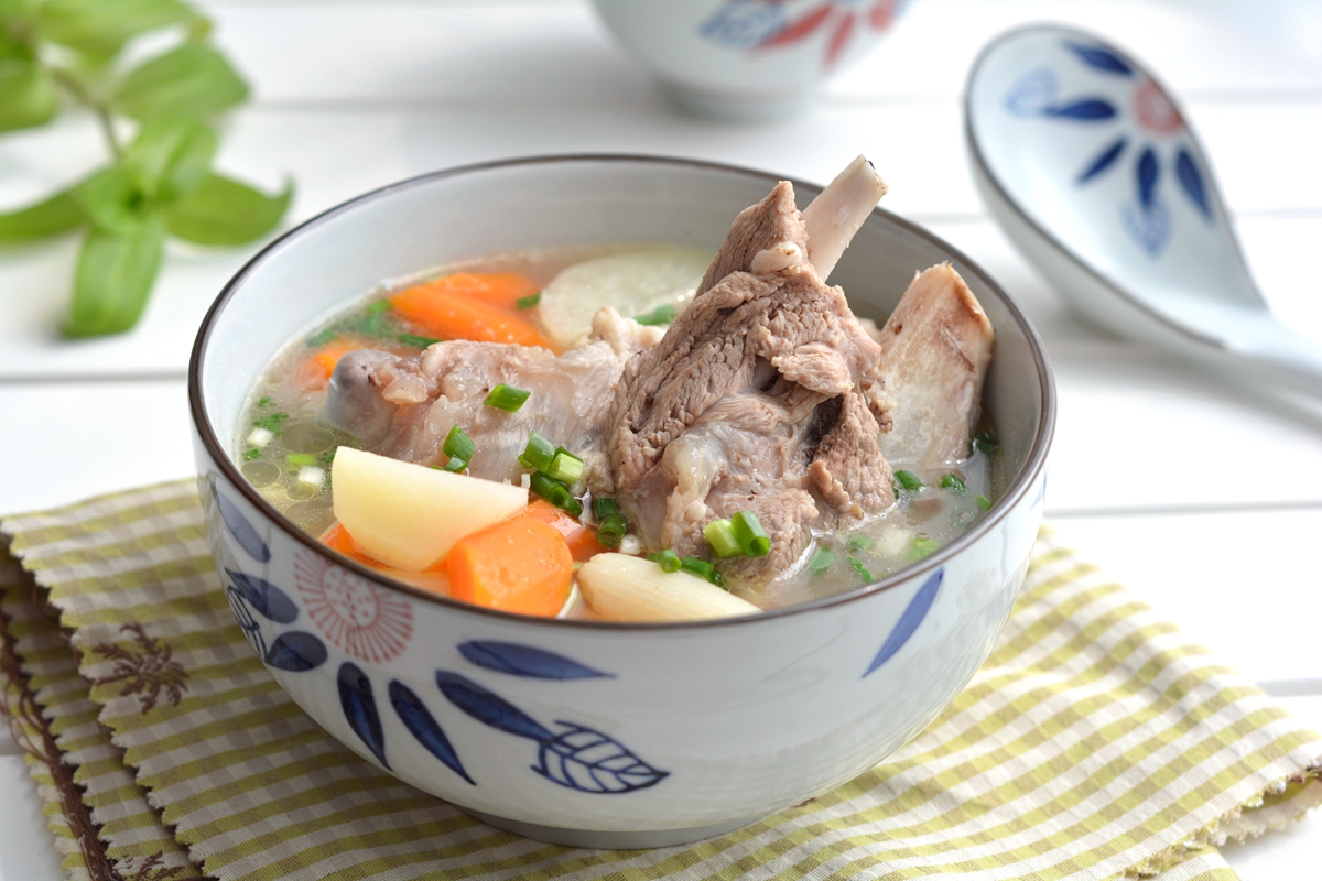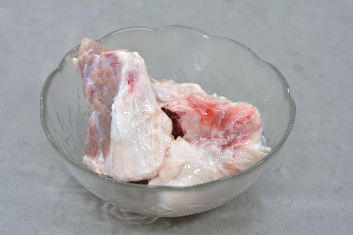 材料:肉骨2块,土豆1个,胡萝卜2根,姜1小块,香葱适量,盐少许,热水适量