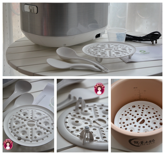 电源线、说明书这俩必不可少;量杯、饭勺、汤勺,让操作起来更方便;蒸屉使这口电饭煲的功能更强大,蒸屉脚的材质也是食品级硅胶的,放在内胆中,也不会将表面划伤。