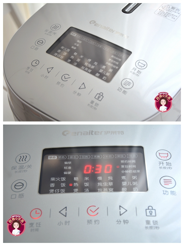 上盖面板靠下部分是超大LED显示屏,功能一应俱全,用手轻轻一触碰即可选择。字体清晰,不管是年轻人还是老年人,都可看图看字轻松操作。除了多种口味的米饭功能,还有煮粥、煲汤、酸奶、婴儿粥、炖燕窝、热饭等特殊功能,并且增加了“童锁”功能,确保家里好动的小宝宝不小心误操作。