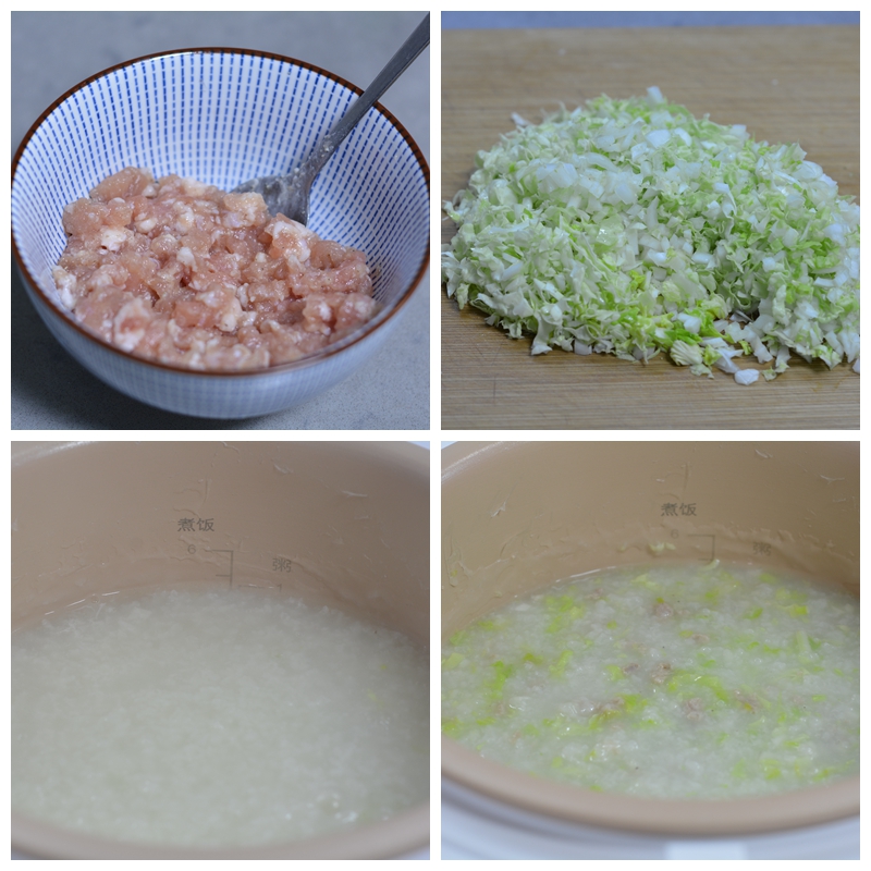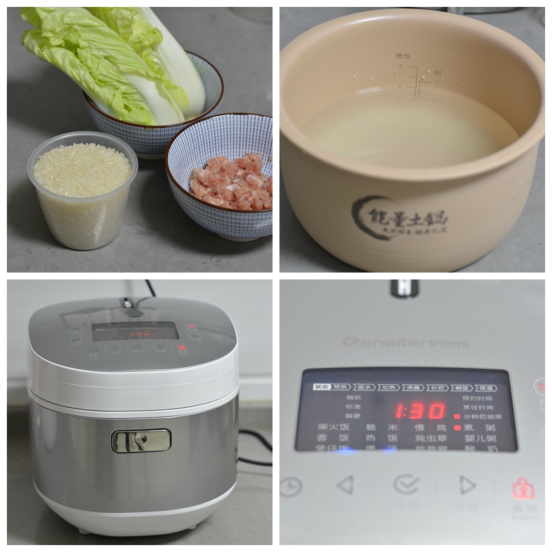 材料:大米1杯,小白菜芯2棵,猪肉馅80克,盐少许,白胡椒粉1克,凉水适量