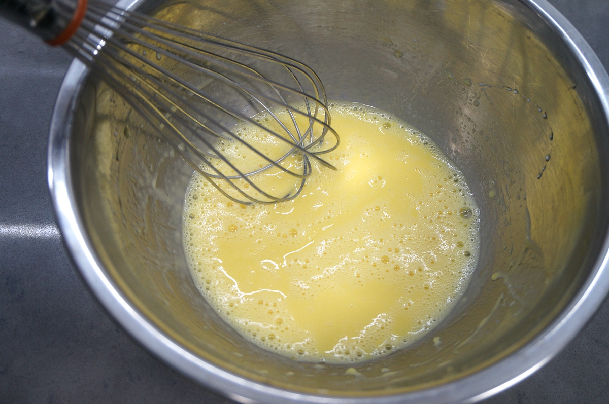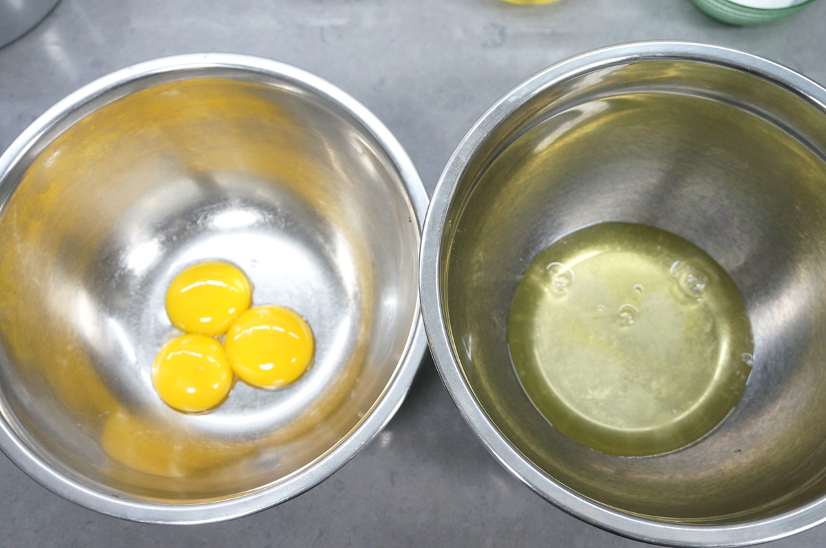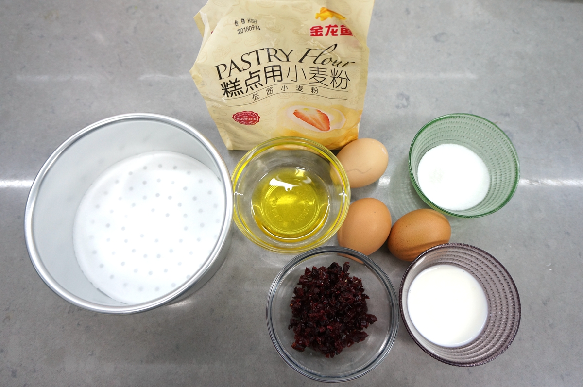 材料:57克带壳鸡蛋3个,细砂糖40克,玉米油20克,牛奶40克,低筋面粉70克,蔓越莓干20克