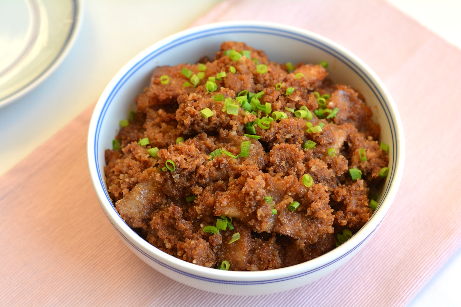 7. 用蒸锅或者蒸箱都可以,大火蒸60分钟左右,蒸得越久,肉片越不腻,米粉越软糯;出锅后撒少许香葱点缀。