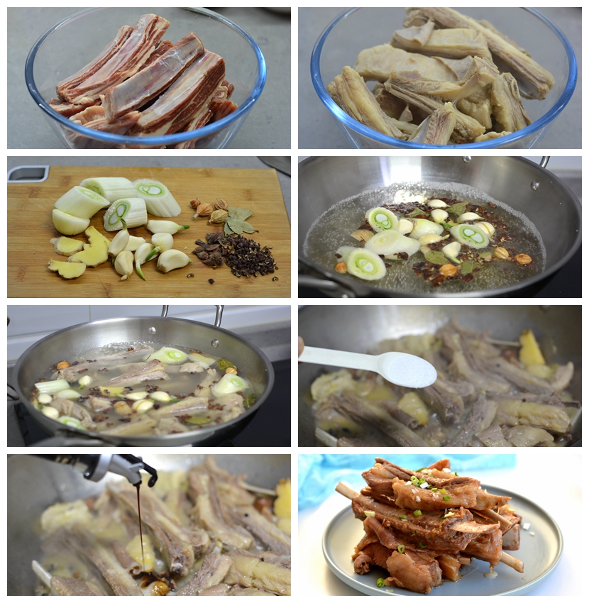 1. 羊排顺着肋骨分开,焯水捞出;
