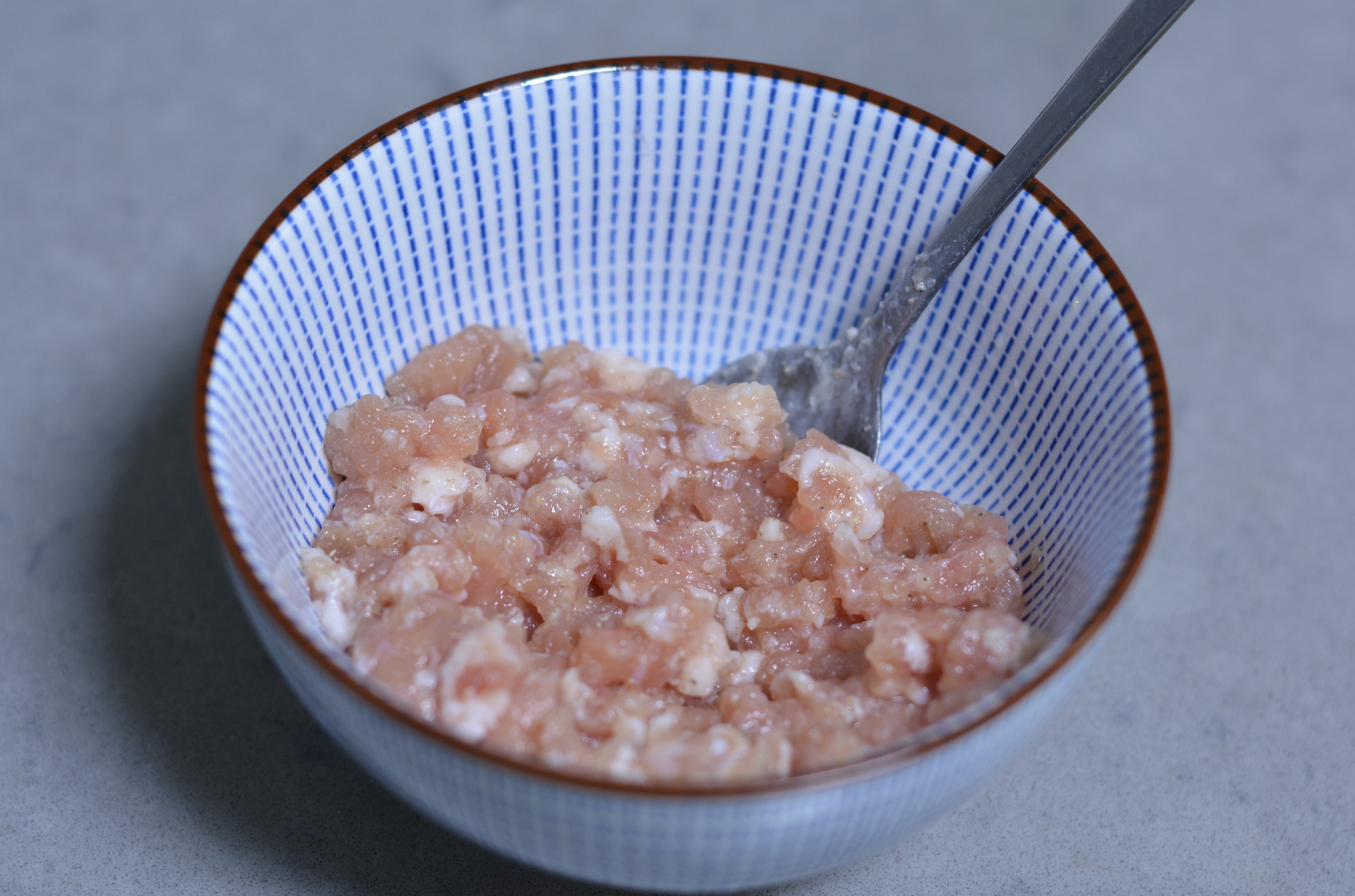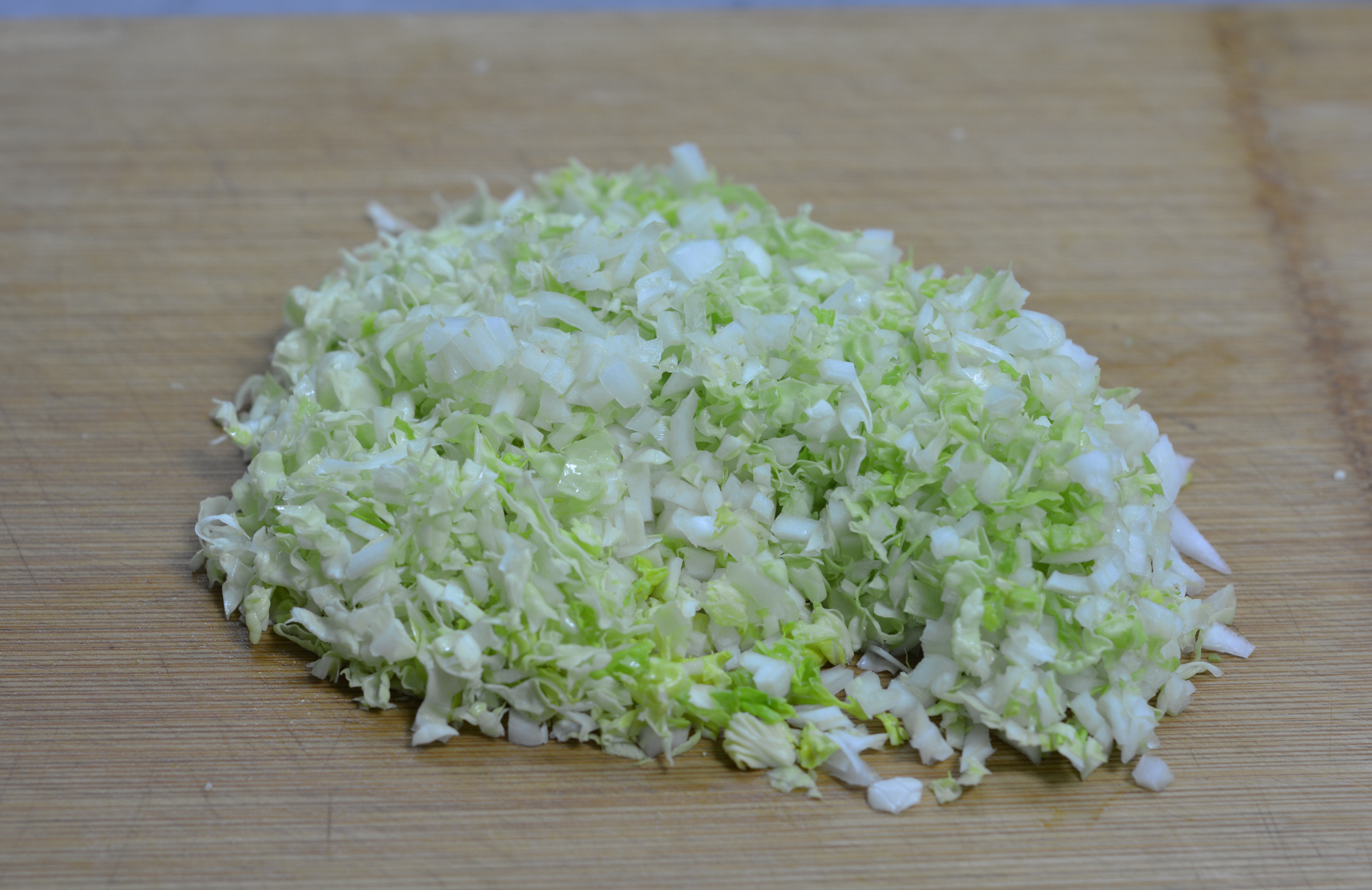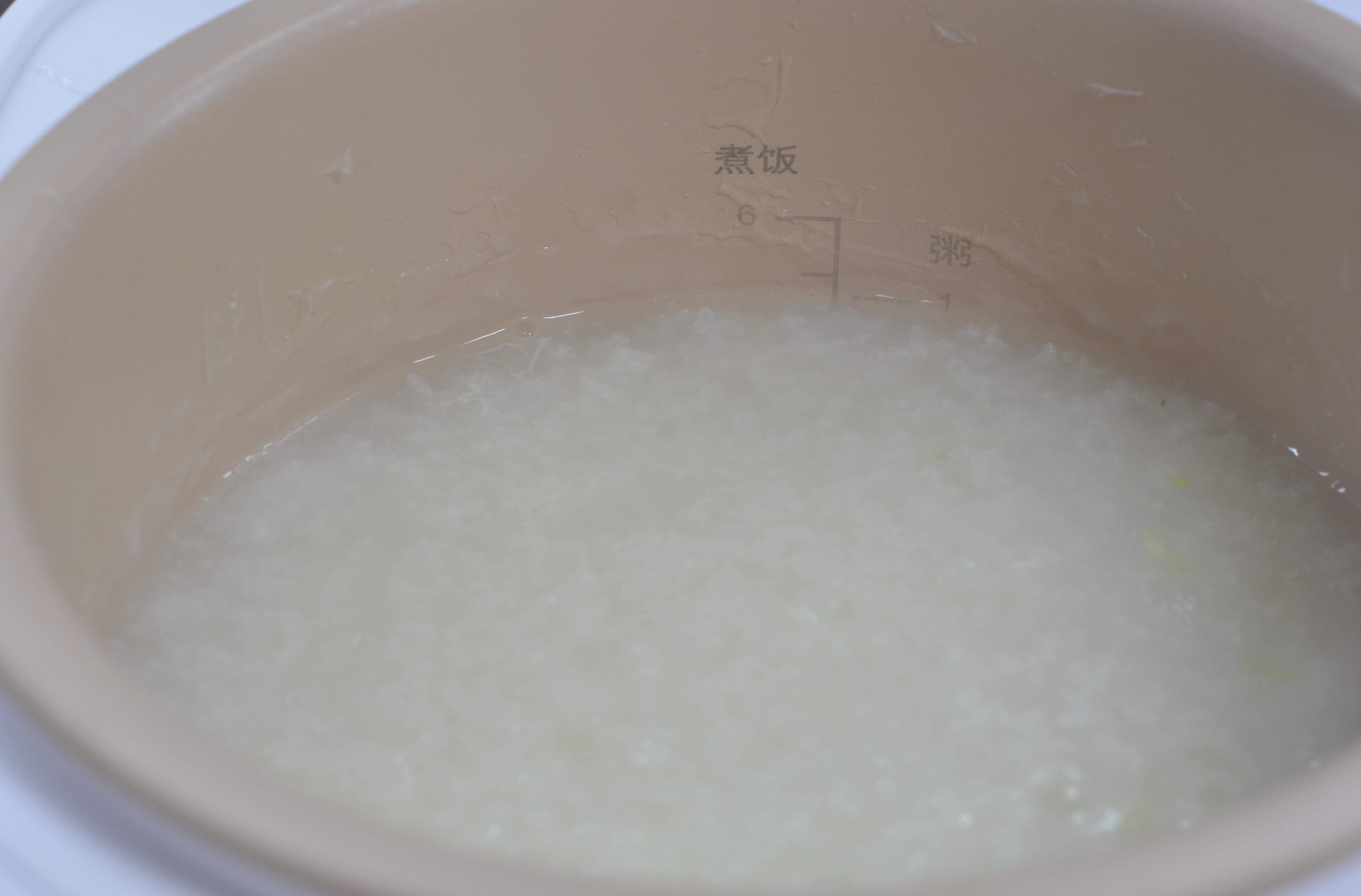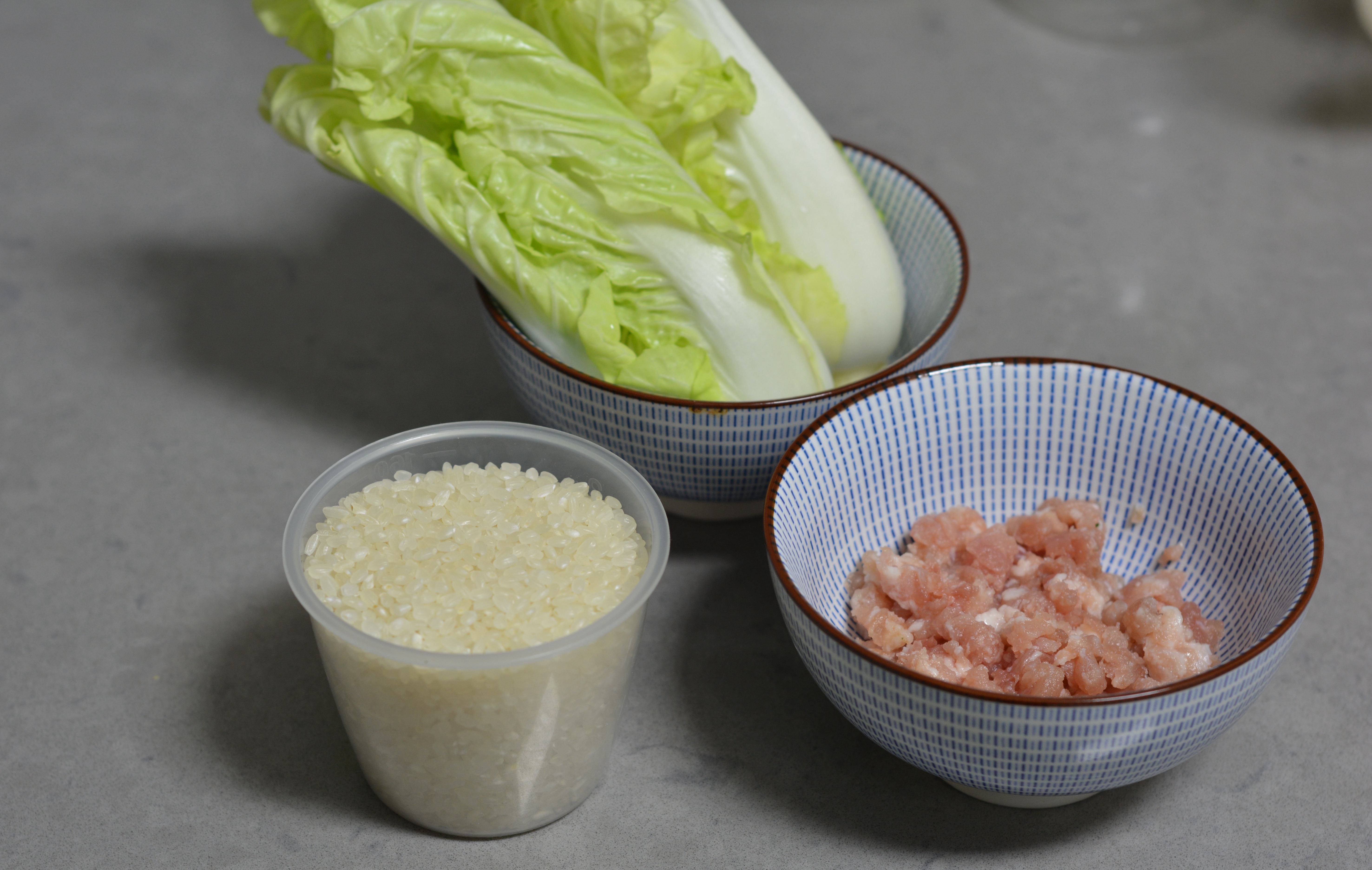 材料:大米1杯,小白菜芯2棵,猪肉馅80克,盐少许,白胡椒粉1克,凉水适量