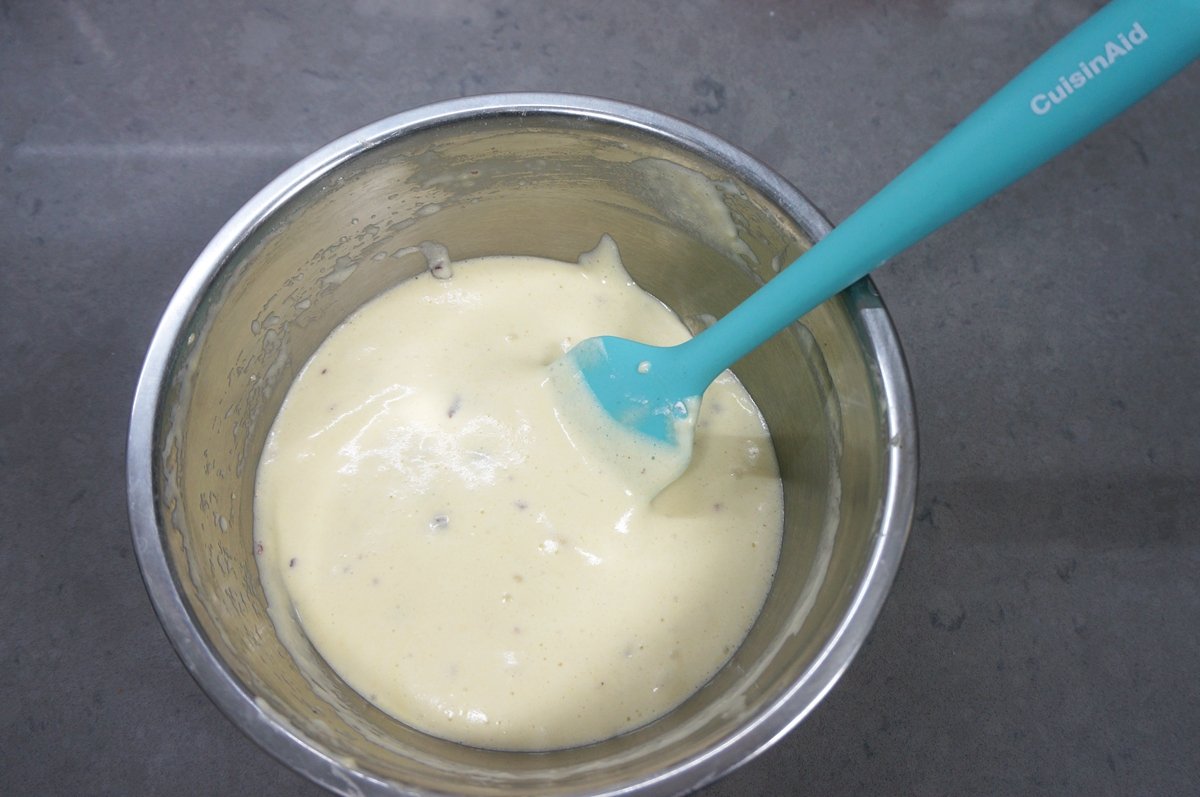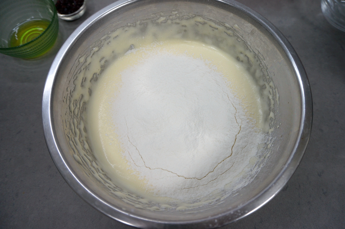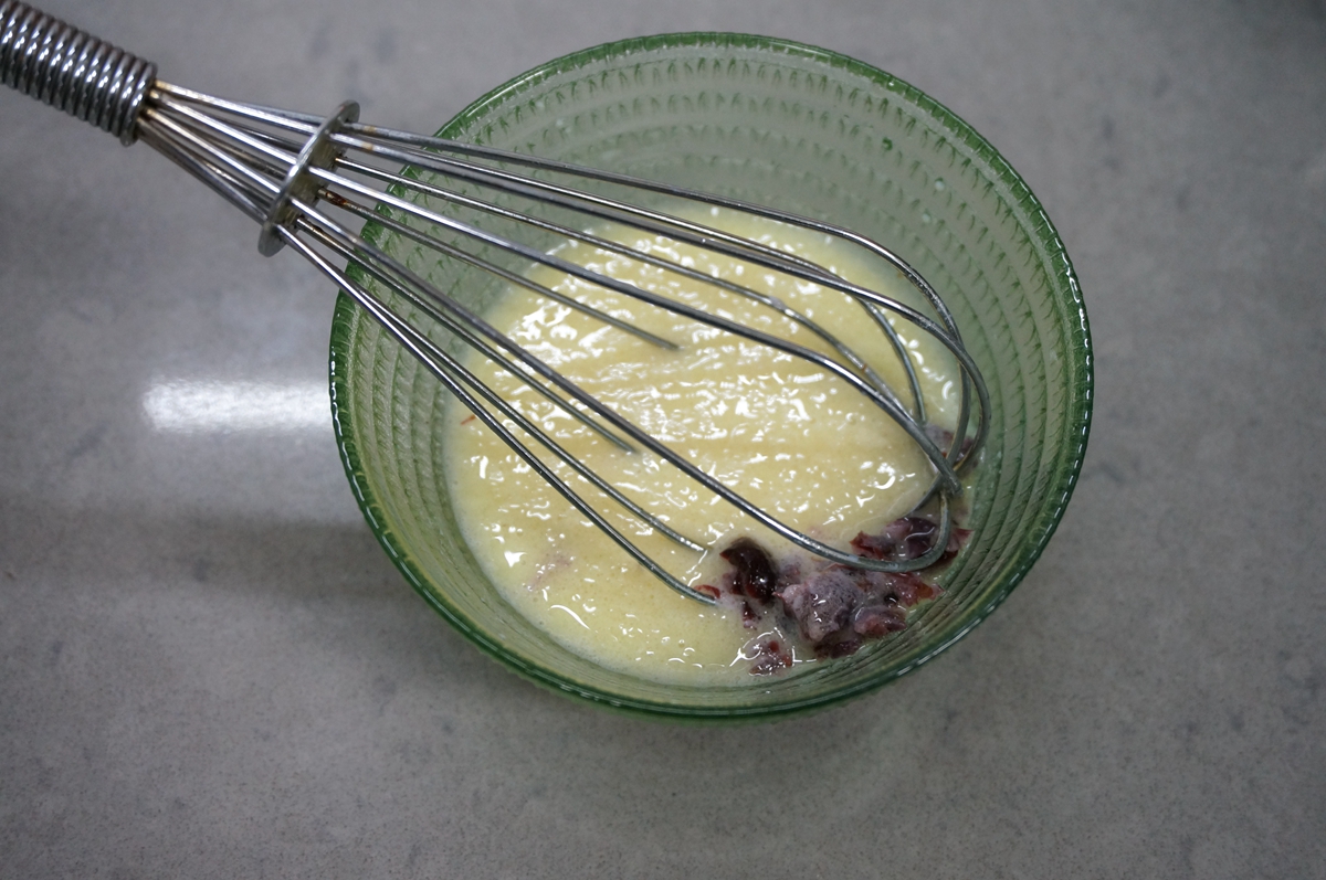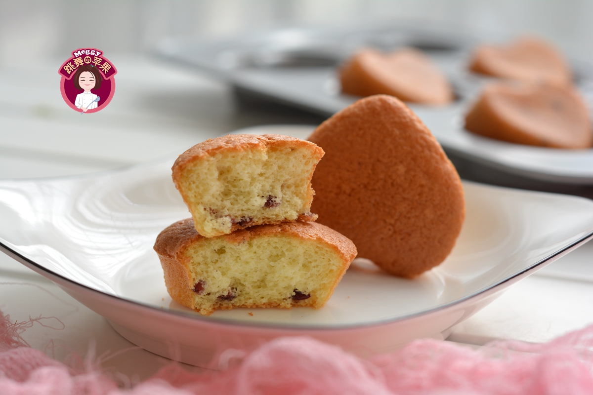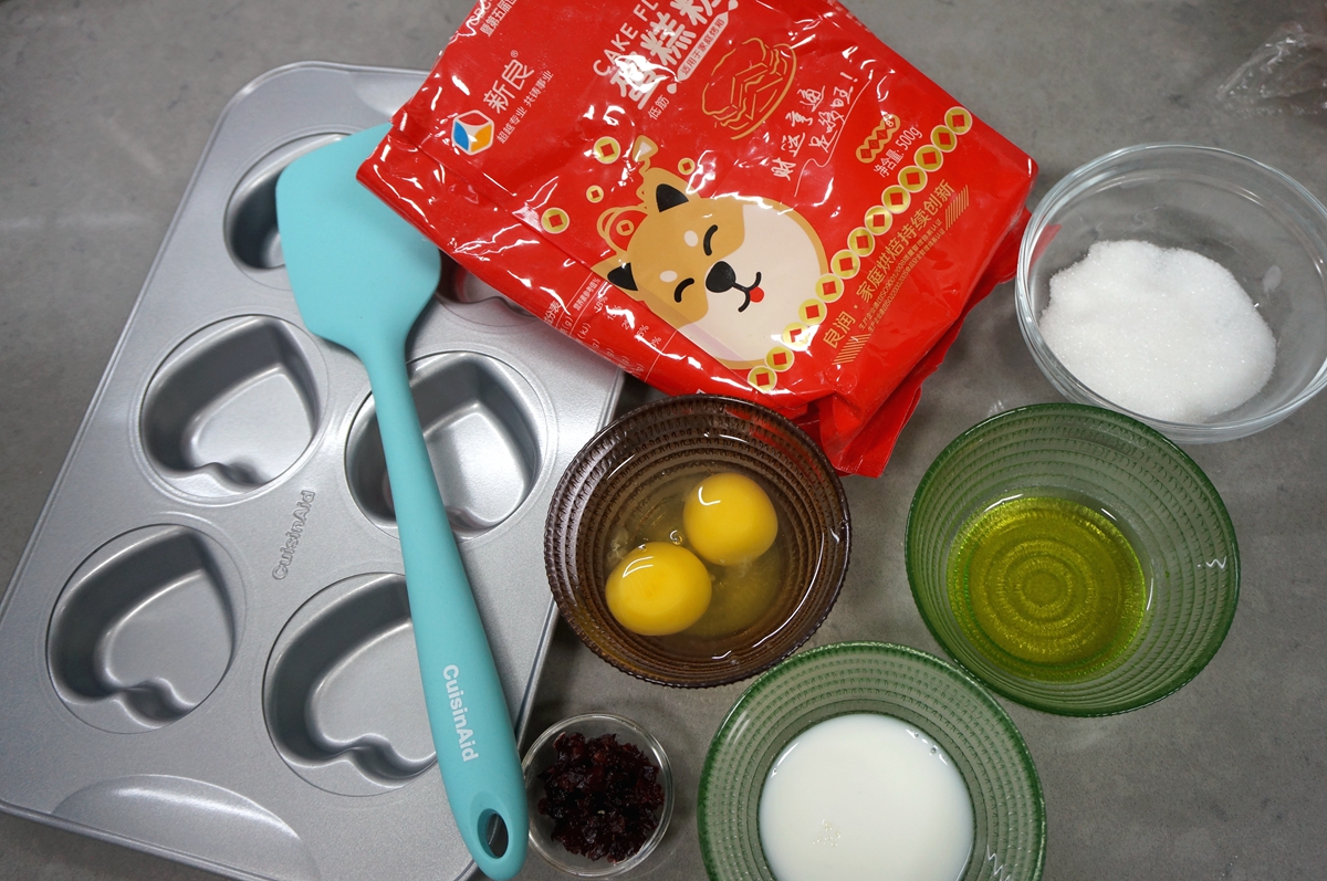 材料:65克带壳鸡蛋2个,低筋面粉55克,玉米油20克,牛奶25克,细砂糖40克,蔓越莓干10克